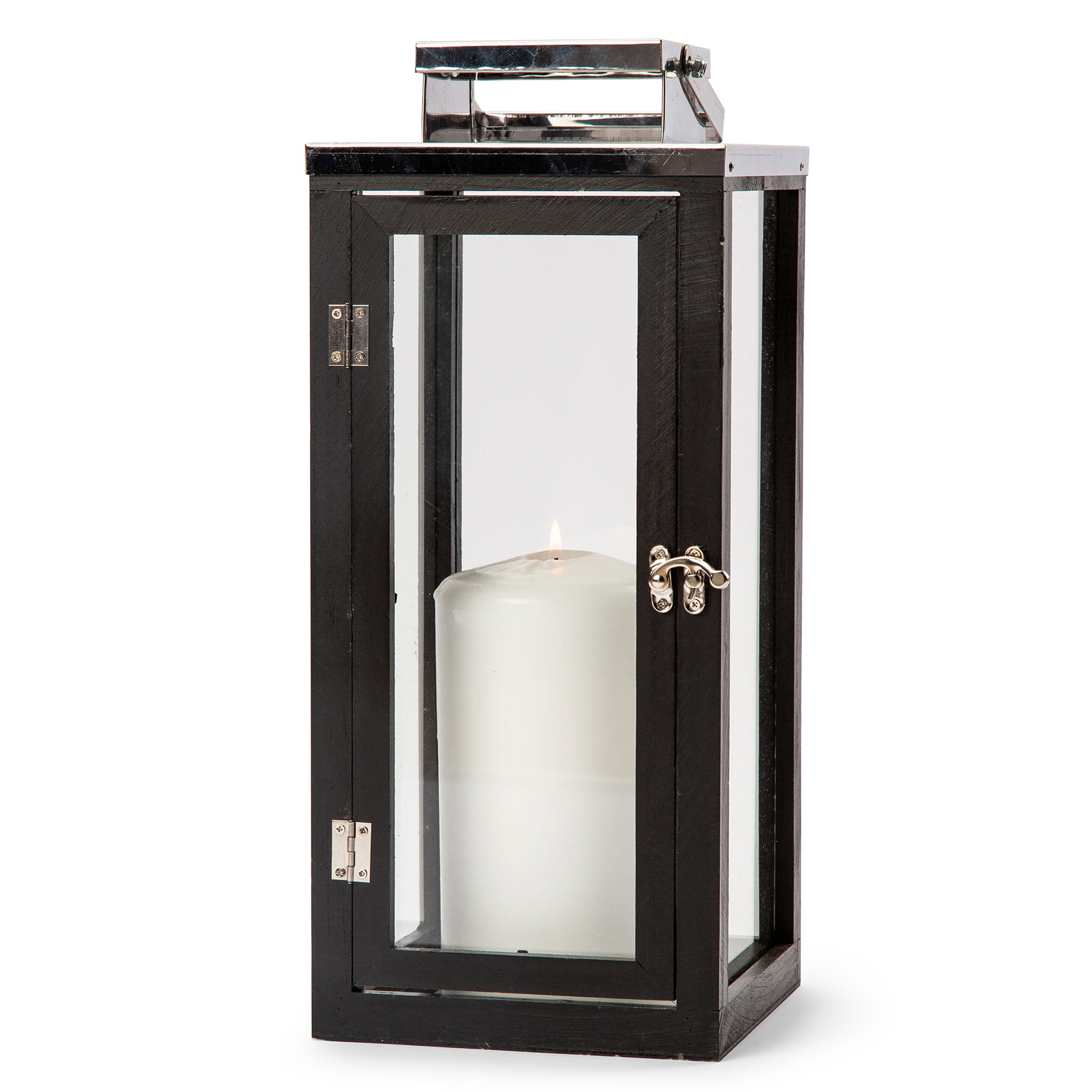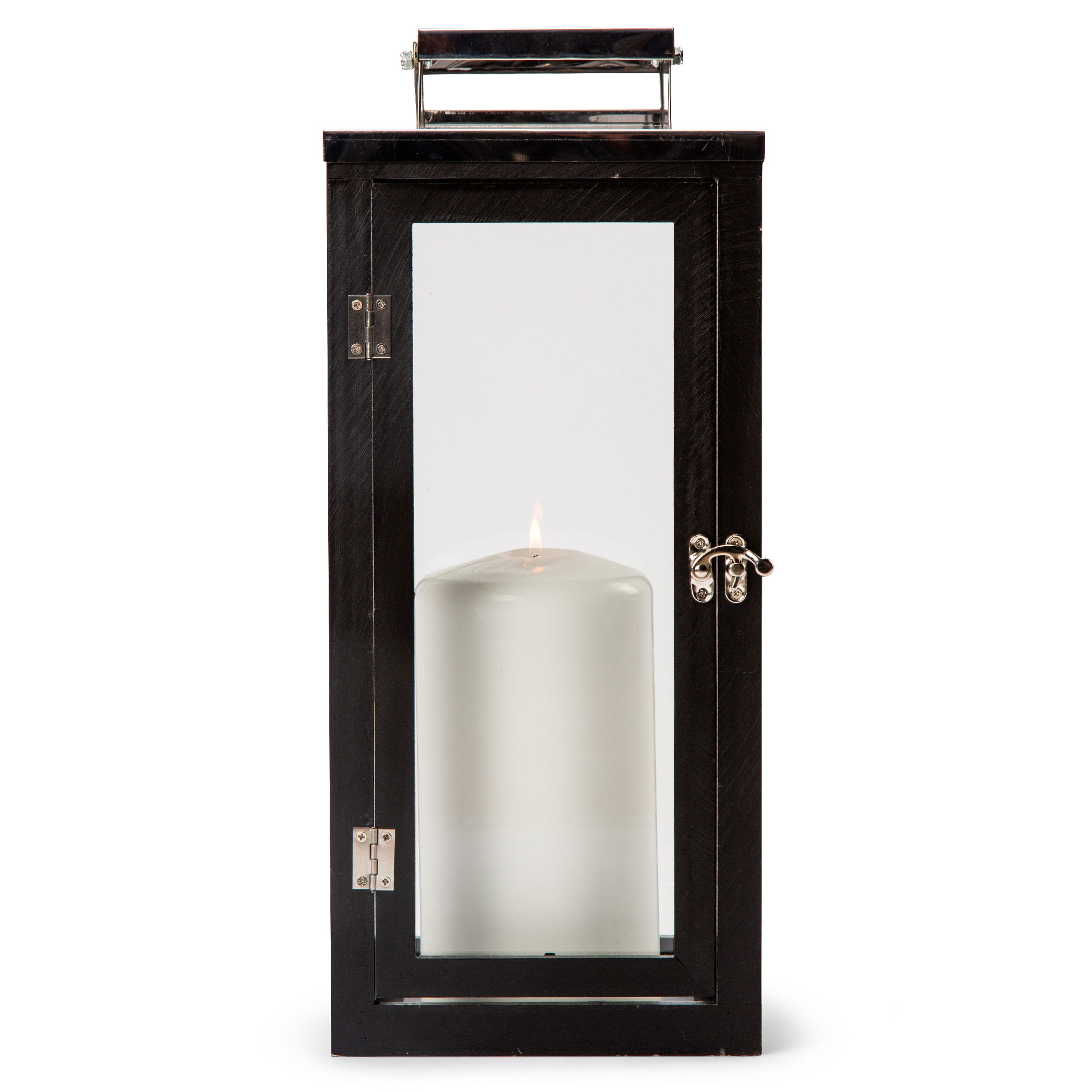 Schwarze Holzlaterne von Orrefors Jernverk. Die Laterne besteht aus lackiertem Kiefernholz mit Details aus Edelstahl und Glasseiten. Öffnet und schließt sich mit einem kleinen Herzog an der Vorderseite. Die Laterne ist ein stilvolles Detail in jedem Interieur und spendet zudem ein gemütliches Licht. Bei warmem Wetter kann die Laterne auch draußen unter einem Baldachin verwendet werden (ohne Kerze).