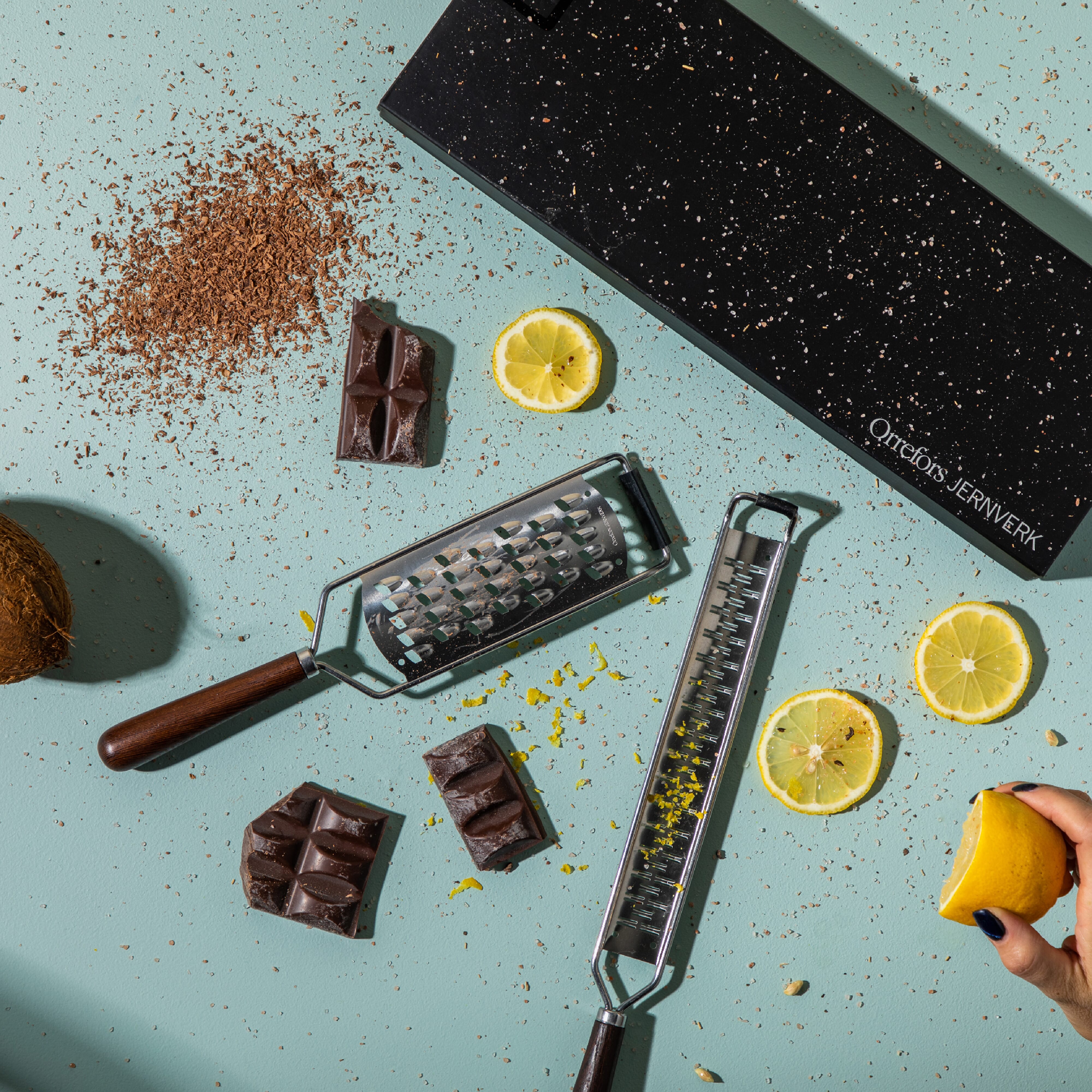 Set aus zwei Orrefors Jernverk-Reiben, verpackt in einer luxuriösen Geschenkbox. Die breite Gourmet-Reibe eignet sich sehr gut zum Reiben größerer Flocken. Der Gummistreifen an der Vorderseite ist gegen die Oberfläche geneigt und macht das Hobeln sicher.