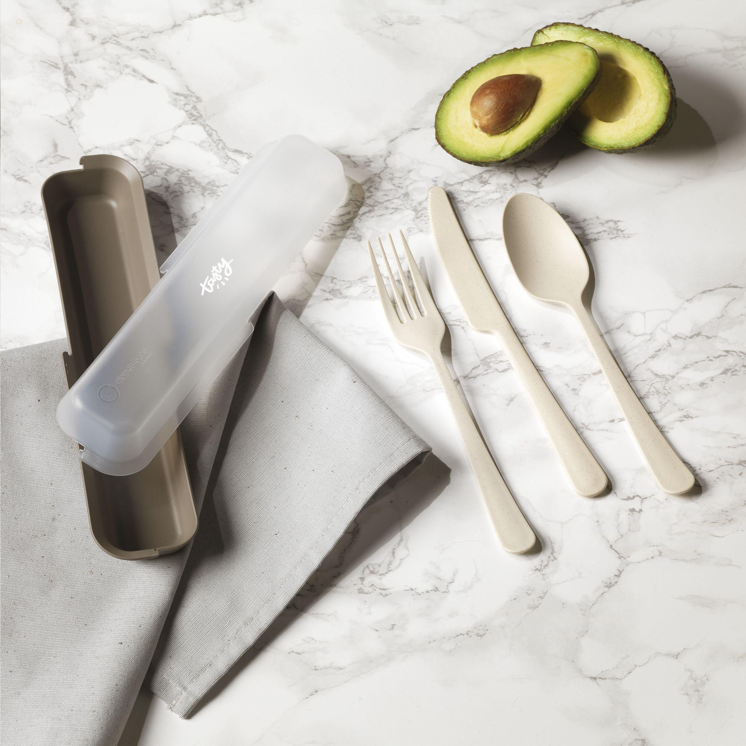 Kunststoff-Besteck der Marke Circulware. Das Set besteht aus einem Löffel, einer Gabel und einem gezackten Messer. Hervorragend geeignet zum Wandern, Campen oder für unterwegs. Leicht, praktisch und handlich. Spülmaschinengeeignet. Handwäsche wird empfohlen, um den Aufdruck zu erhalten. Mikrowellengeeignet. 100% recycelbar. Dieses Set trägt zu einer Kreislaufwirtschaft bei. Wird pro Set in einer stabilen, passenden Kassette geliefert. Niederländisches Design. Made in Holland.