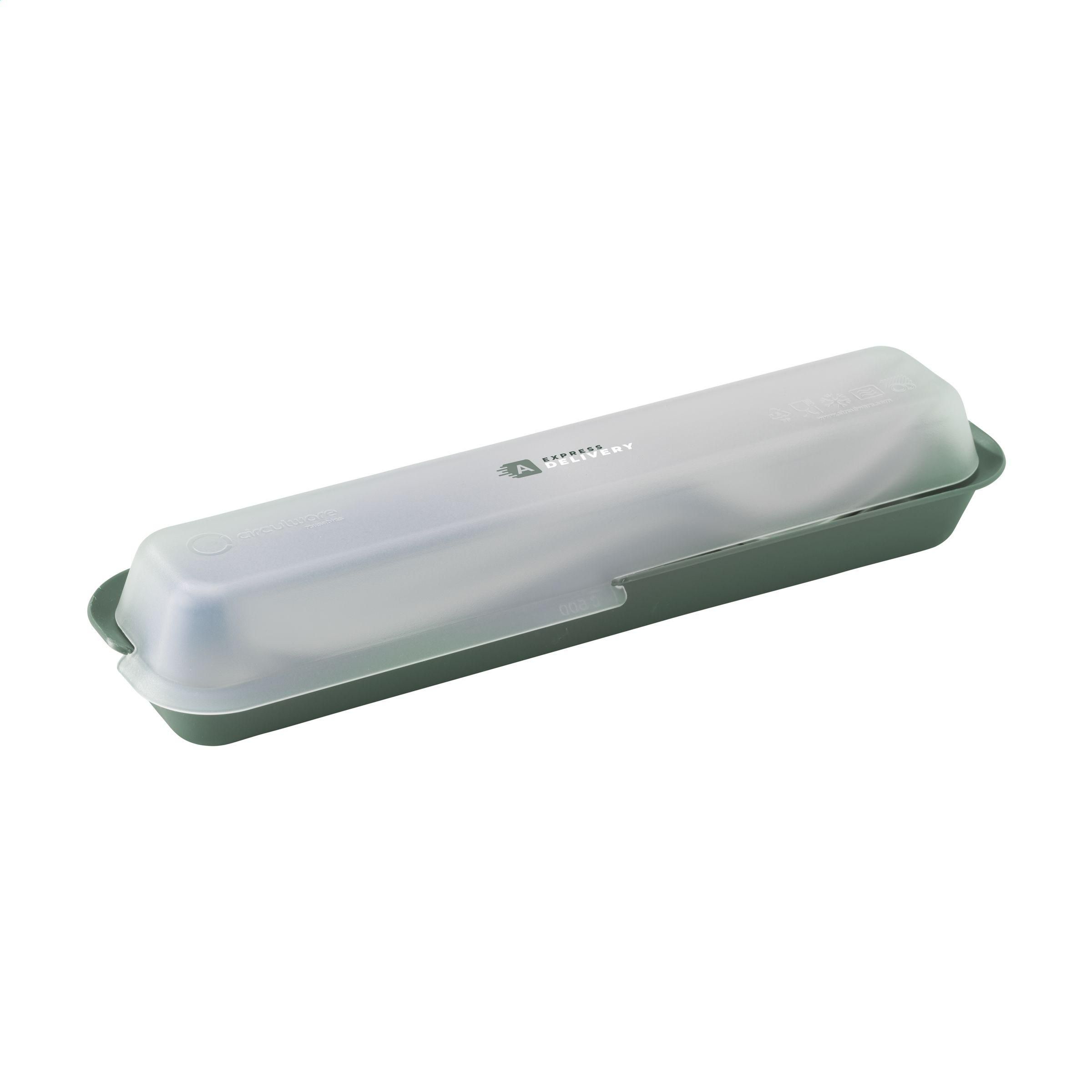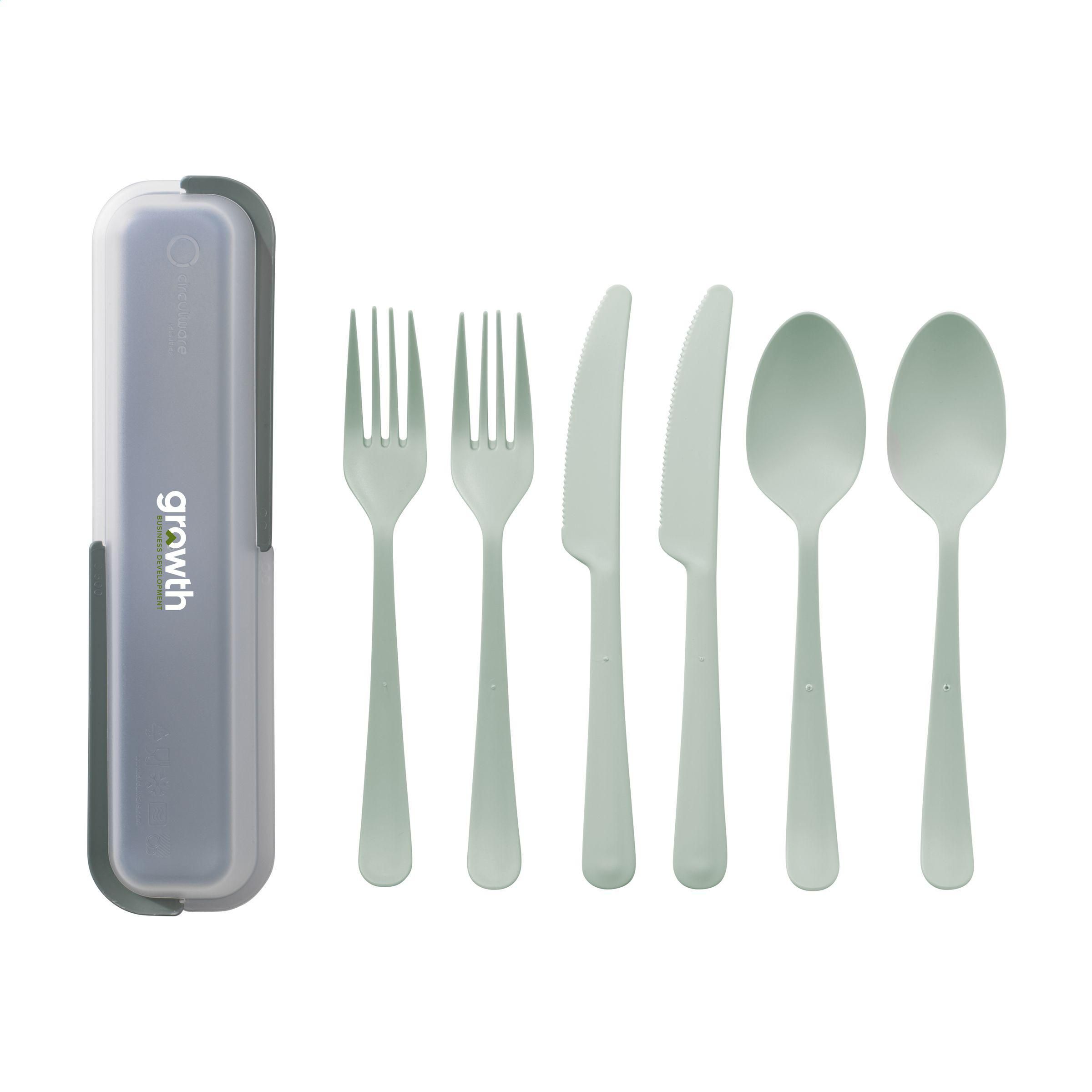 6-teiliges, wiederverwendbares Kunststoff-Besteck der Marke Circulware. Das Set besteht aus 2 Löffeln, 2 Gabeln und 2 gezackten Messern. Hervorragend geeignet zum Wandern, Campen oder für unterwegs. Leicht, praktisch und handlich. Spülmaschinengeeignet. Handwäsche wird empfohlen, um den Aufdruck zu erhalten. Mikrowellengeeignet. 100% recycelbar. Dieses Set trägt zu einer Kreislaufwirtschaft bei. Wird pro Set in einer stabilen, passenden Kassette geliefert. Niederländisches Design. Made in Holland.