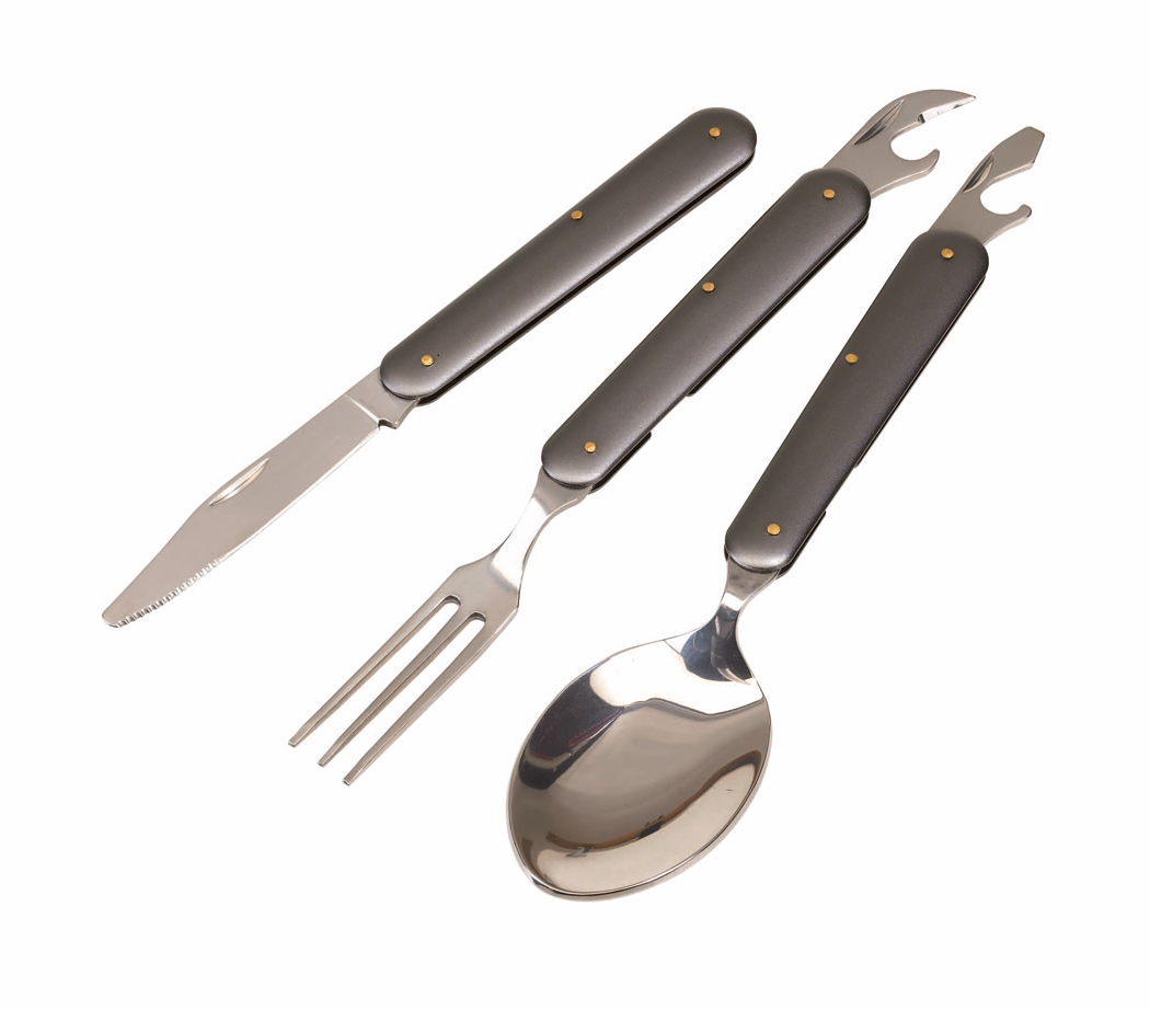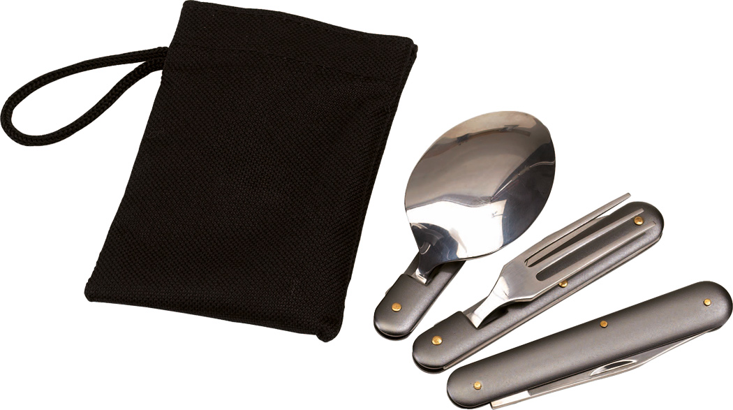 Outdoor-Besteck-Set CAMPING, 3-teilig: bestehend aus zusammenklappbarem Messer, Gabel mit Dosenöffner, Löffel und Flaschenöffner, in Nylon-Beutel mit Klettverschluss und Trageschlaufe