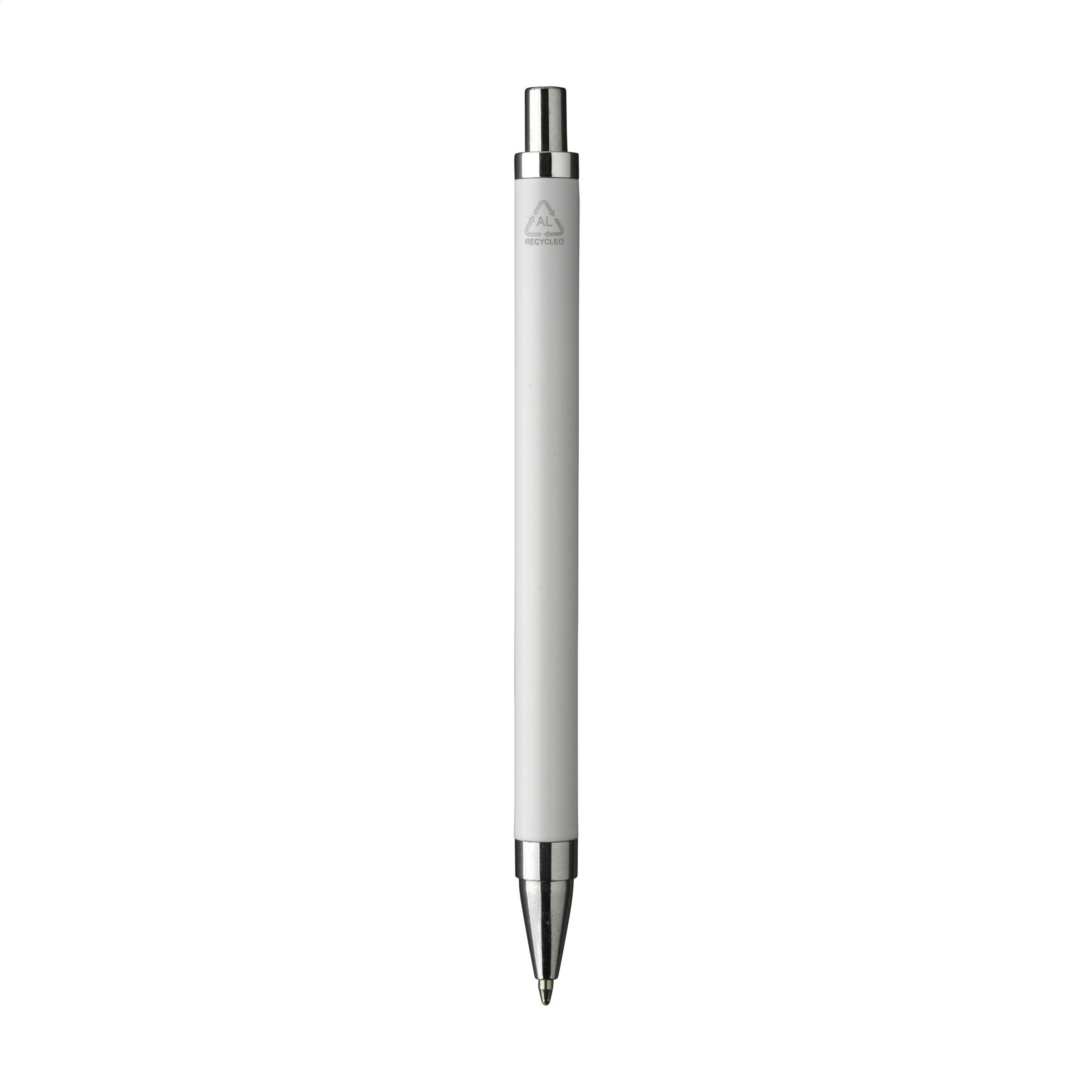 Modischer, blauschreibender Kugelschreiber mit einem Gehäuse aus 100% recyceltem Aluminium mit mattem Finish. Mit formschönem Metallclip und Gehäuse aus einem Stück. RCS-zertifiziert.Durch die Verwendung von recyceltem Aluminium werden bei der Herstellung dieses Produkts weniger neue Rohstoffe verwendet. Das bedeutet weniger Energieverbrauch und weniger Wasserverbrauch.