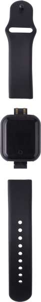 Intelligente Uhr aus PET und PVC mit verstellbarem Armband und drahtloser Technologie. Mit kleiner Taste unterhalb des Bildschirms. Funktionen: Herzfrequenz, Schlafüberwachung, Sauerstoffmessung, Nachrichtenerinnerung, Trinkwassererinnerung, Trainingserinnerung. USB-Ladegerät im Armband versteckt.