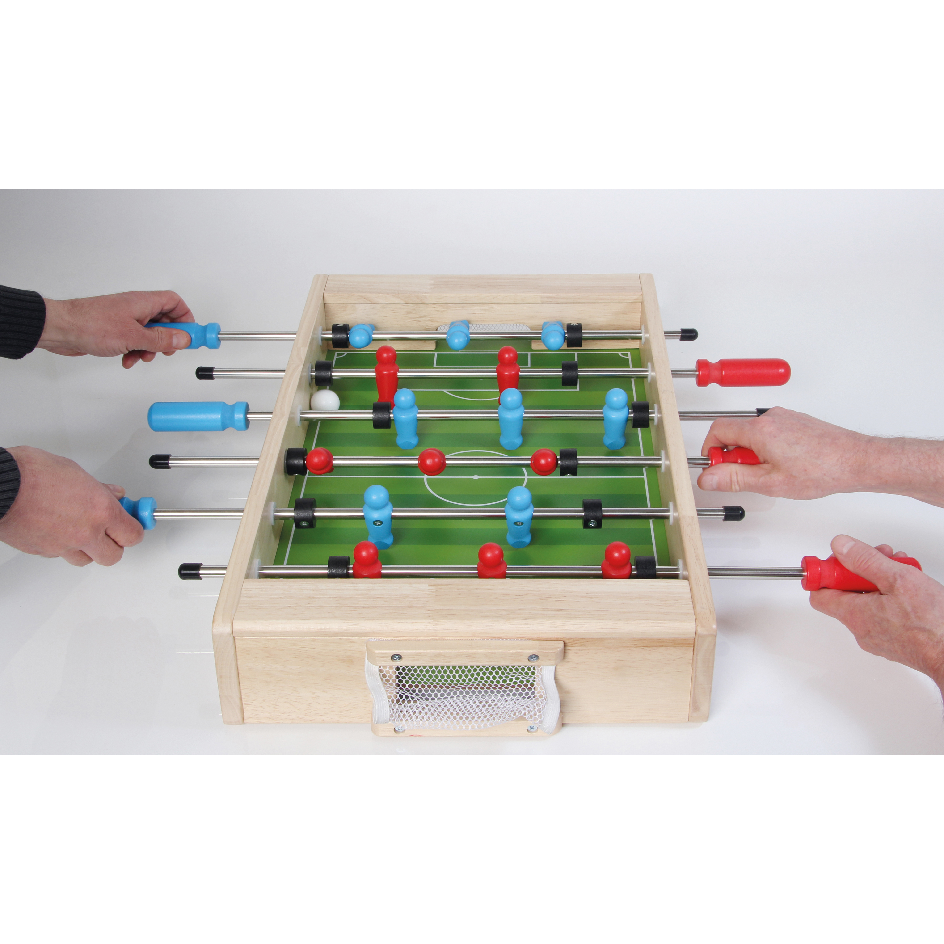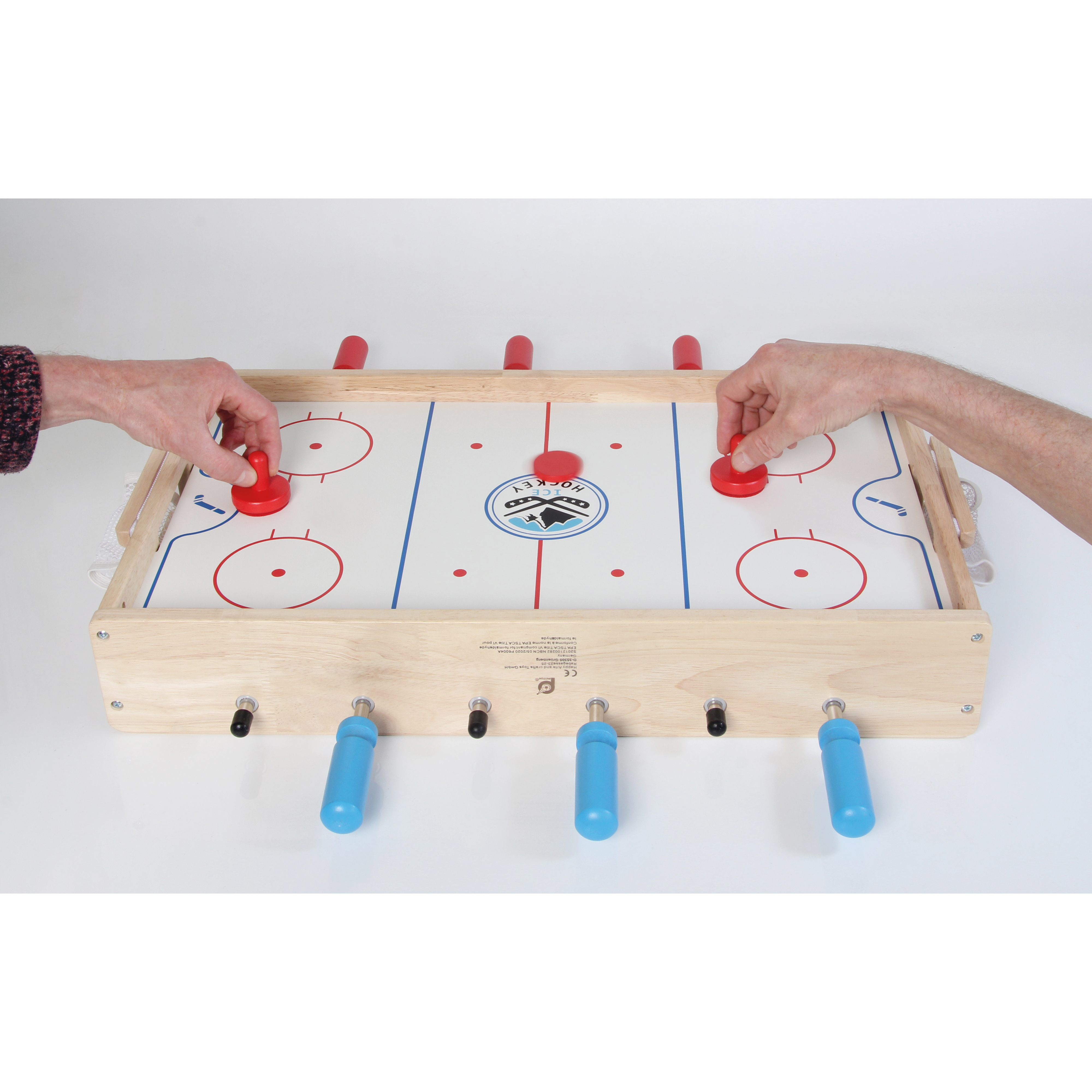 Zwei Spielideen in einem: Fußball und Hockey. Das Spiel besteht aus einem massiven, hölzernen Spiel- brett (beidseitig bespielbar!), einem Ball und zwei Pucks. Dieser Mini-Tisch bietet stundenlangen Wettkampf- spaß für jedes Alter.