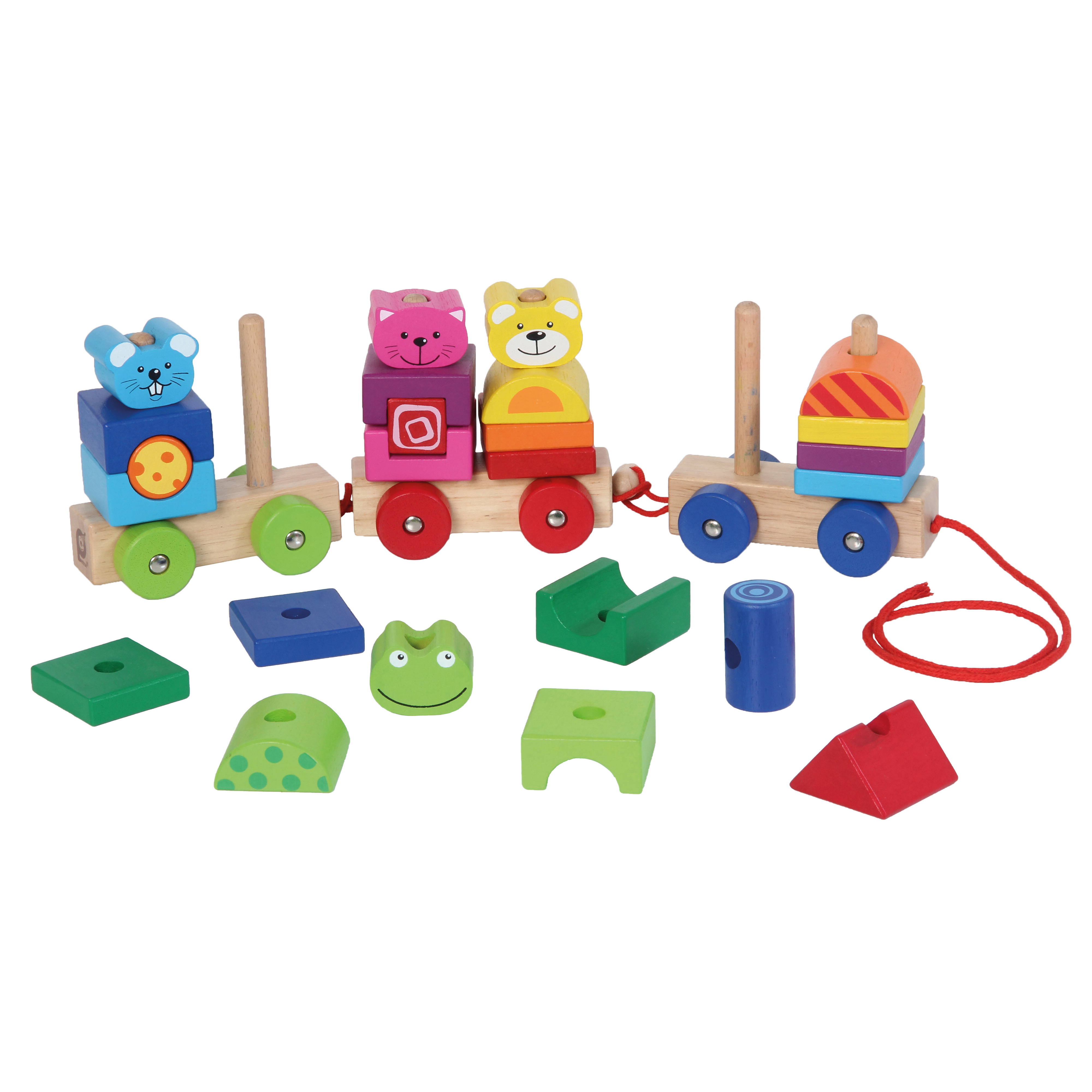 Farbenfroher Nachziehzug bestehend aus einer Lokomotive und 2 Waggons. Der Zug ist komplett zerlegbar. Die Einzelteile sind auf je zwei Rund- stäben pro Waggon bzw. Lok aufgesteckt und somit beliebig austauschbar. Mit der an der Lok befes- tigten Schnur lässt sich der Zug wunderbar nach- ziehen.