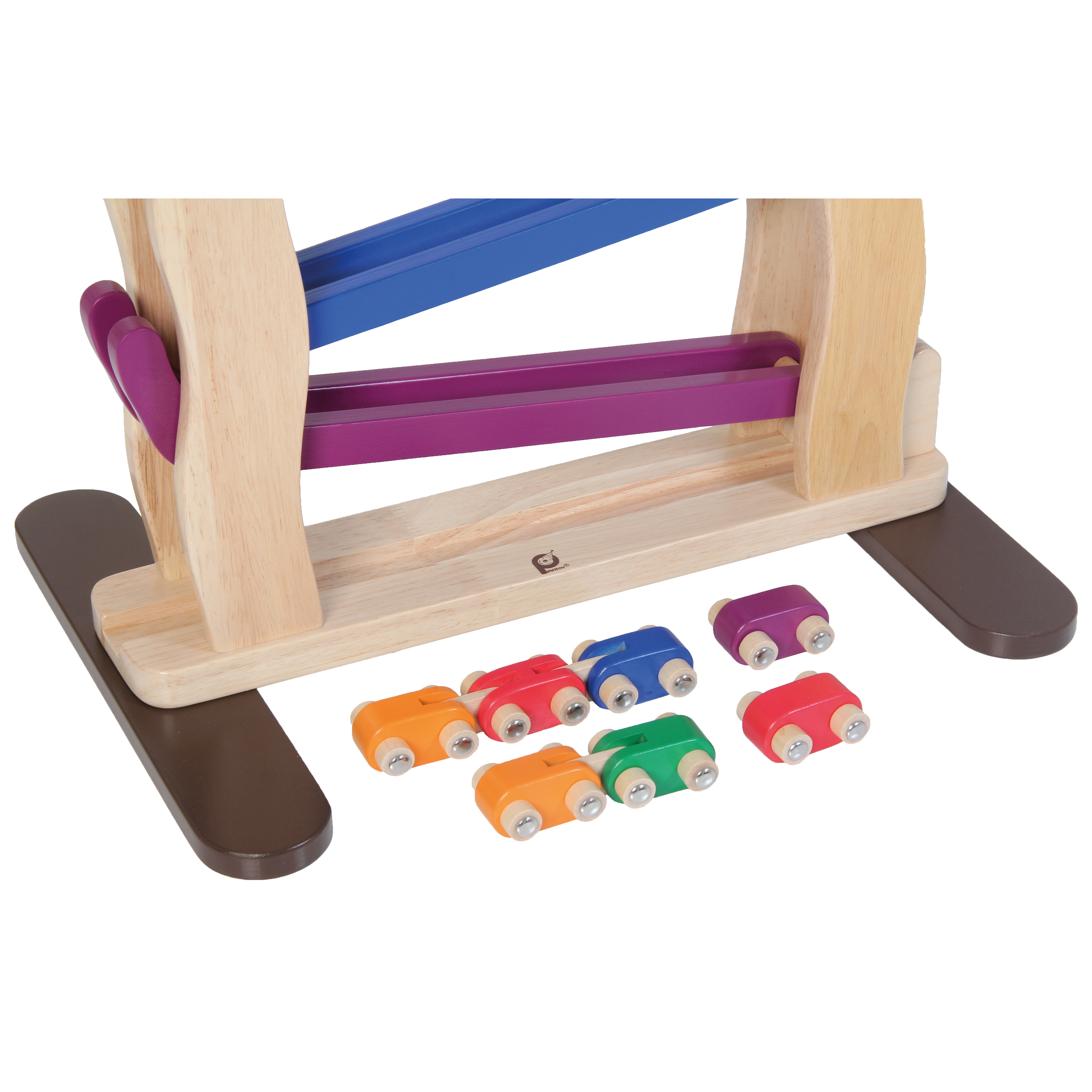 Verschiedene bunte Rennautos laufen die Rollbahn hinunter und überschlagen sich bei jedem Richtungs wechsel. Diese Rollbahn ist ein Blickfang für jedes Kinderzimmer.