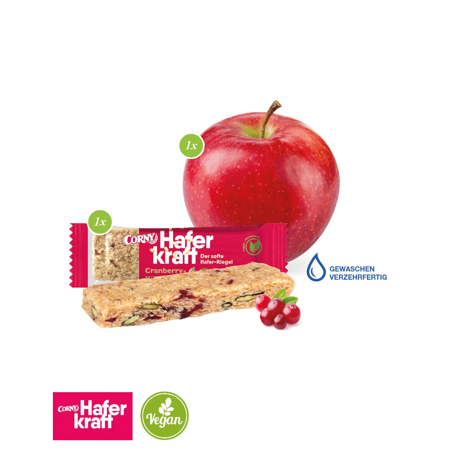 1 Apfel der Saison (z. B. Gala) nach Verfügbarkeit, gewaschen und verzehrfertig und 1 CORNY Haferkraft-Riegel (ca. 35 g, Cranberry-Kürbiskern).