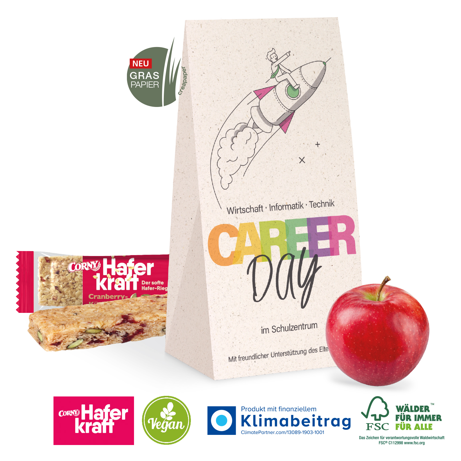 Power für zwischendurch! Individuell bedruckbare Tüte mit einem Apfel der Saison (gewaschen und verzehrfertig) und einem CORNY Haferkraft-Riegel. Frische Energie für Veranstaltungen, Messen, als Goodie-Bag oder als Aufmerksamkeit für Kunden und Kundinnen oder Ihr Team.