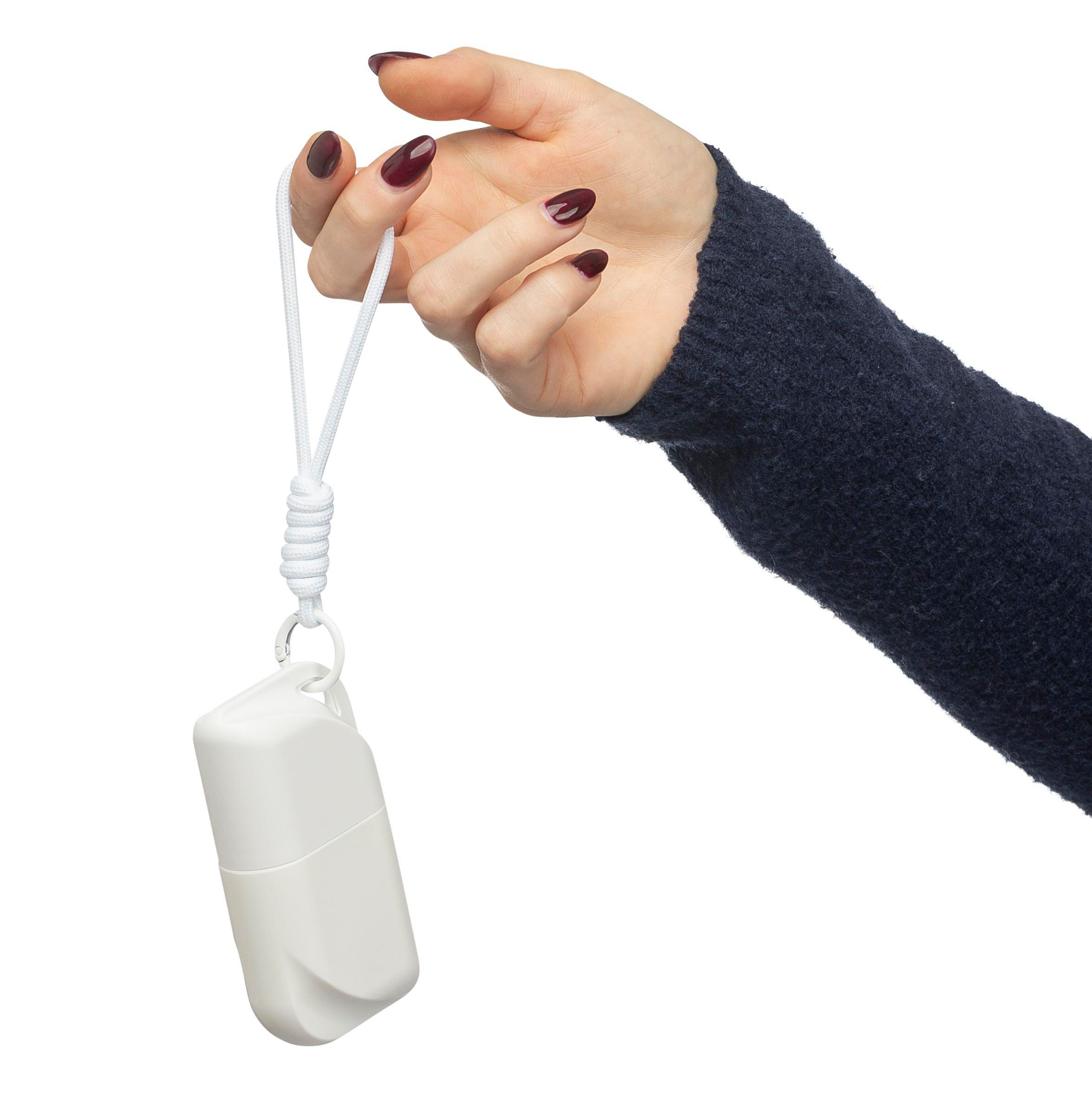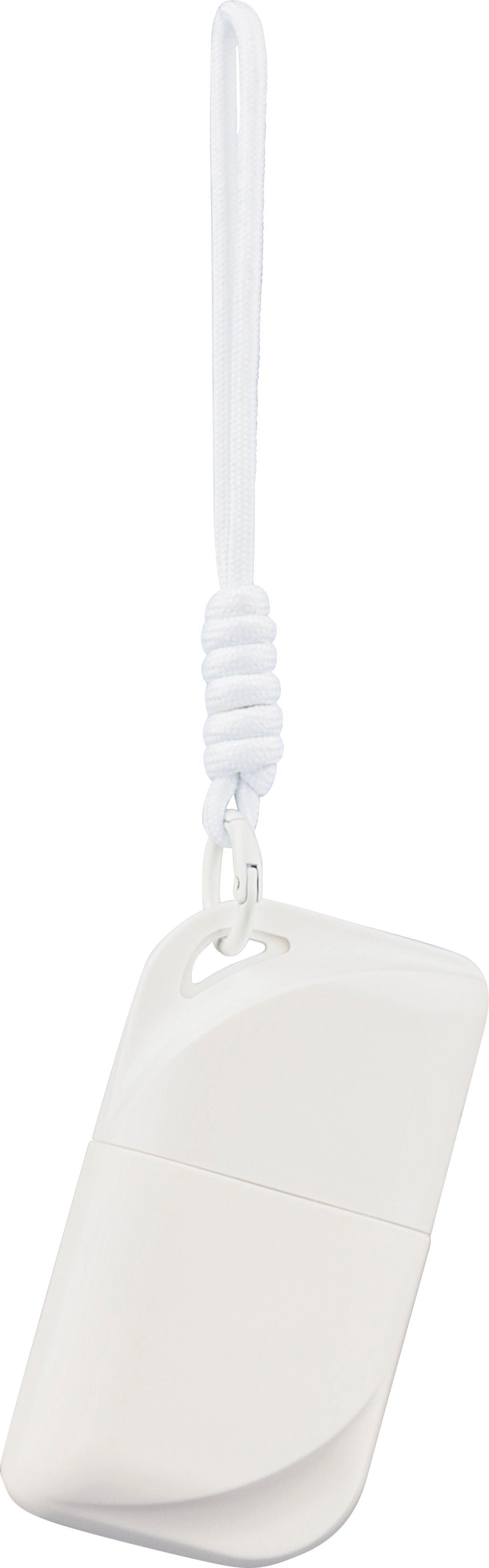 PP-Kassette mit 50 ml Sonnenschutzlotion (LSF 50) sowie einem farblich passenden Polyester-Handgelenkband mit Metallhaken. Auf der Rückseite befindet sich ein Aufkleberheftchen.