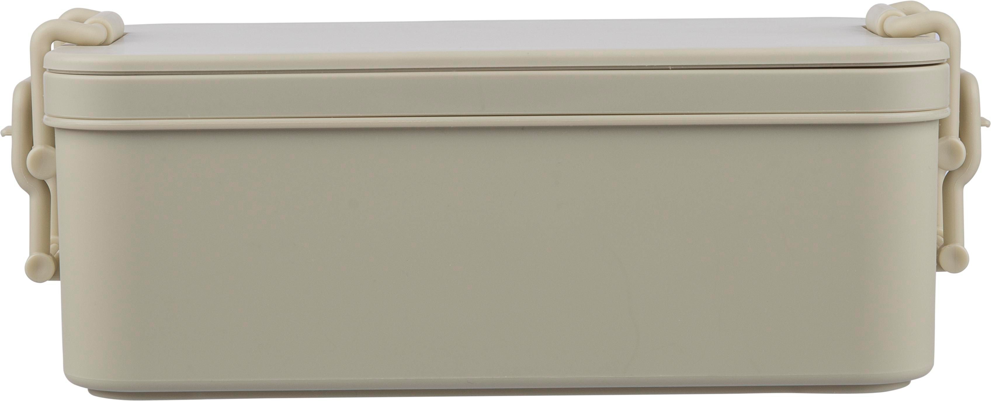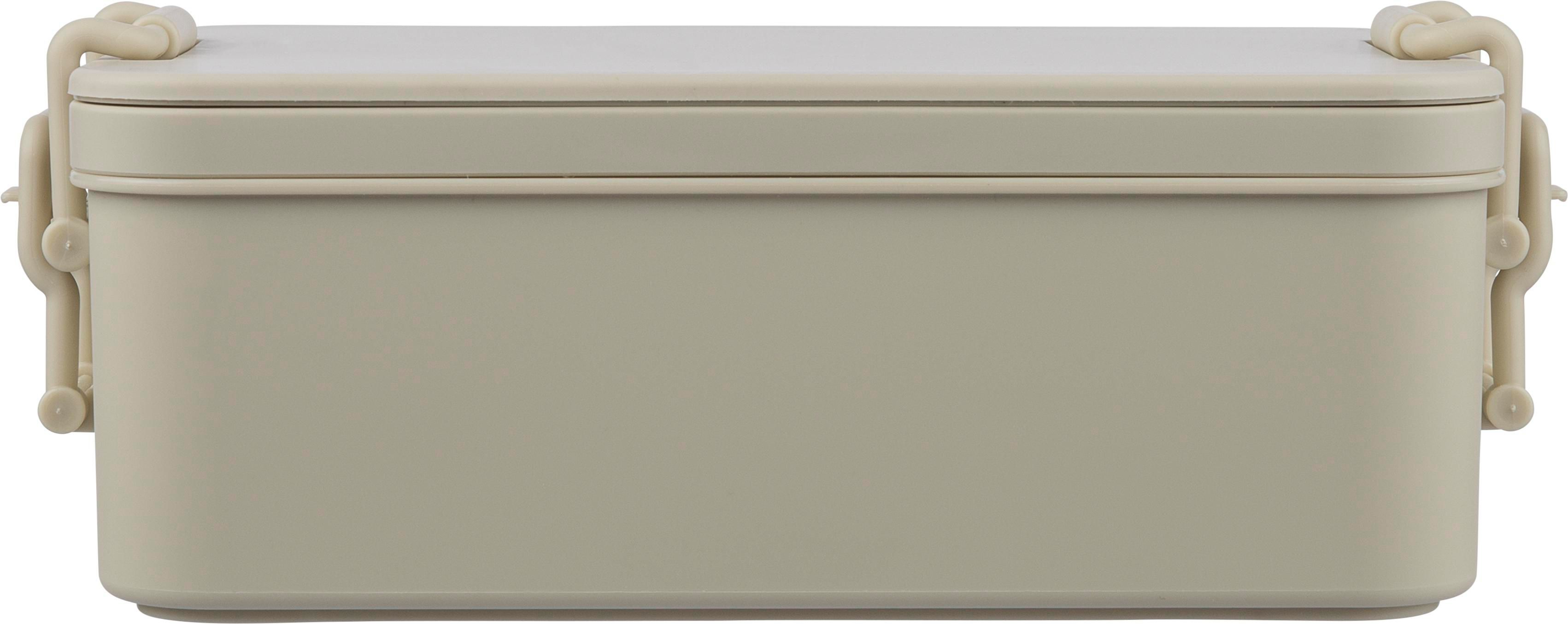 Zweilagige Lunchbox aus PP mit Clipverschluss und PP-Deckel. Das kleinere untere Fach lässt sich in das größere obere Fach stapeln, um das Volumen bei Transport und Lagerung zu reduzieren. Inklusive Zwischenfach mit 3-teiligem Besteckset. Fassungsvermögen: 2.200 ml. In einer Großpackung.