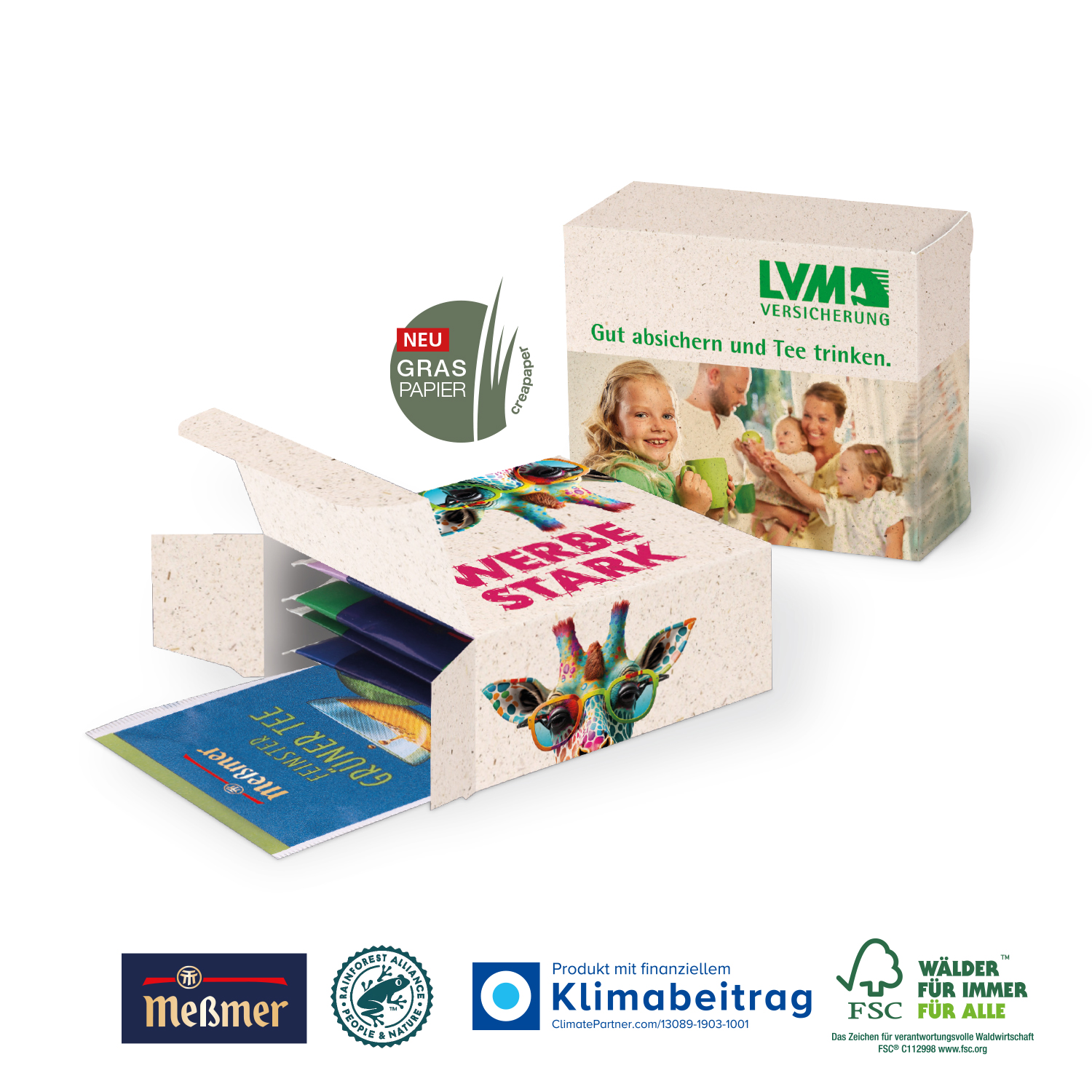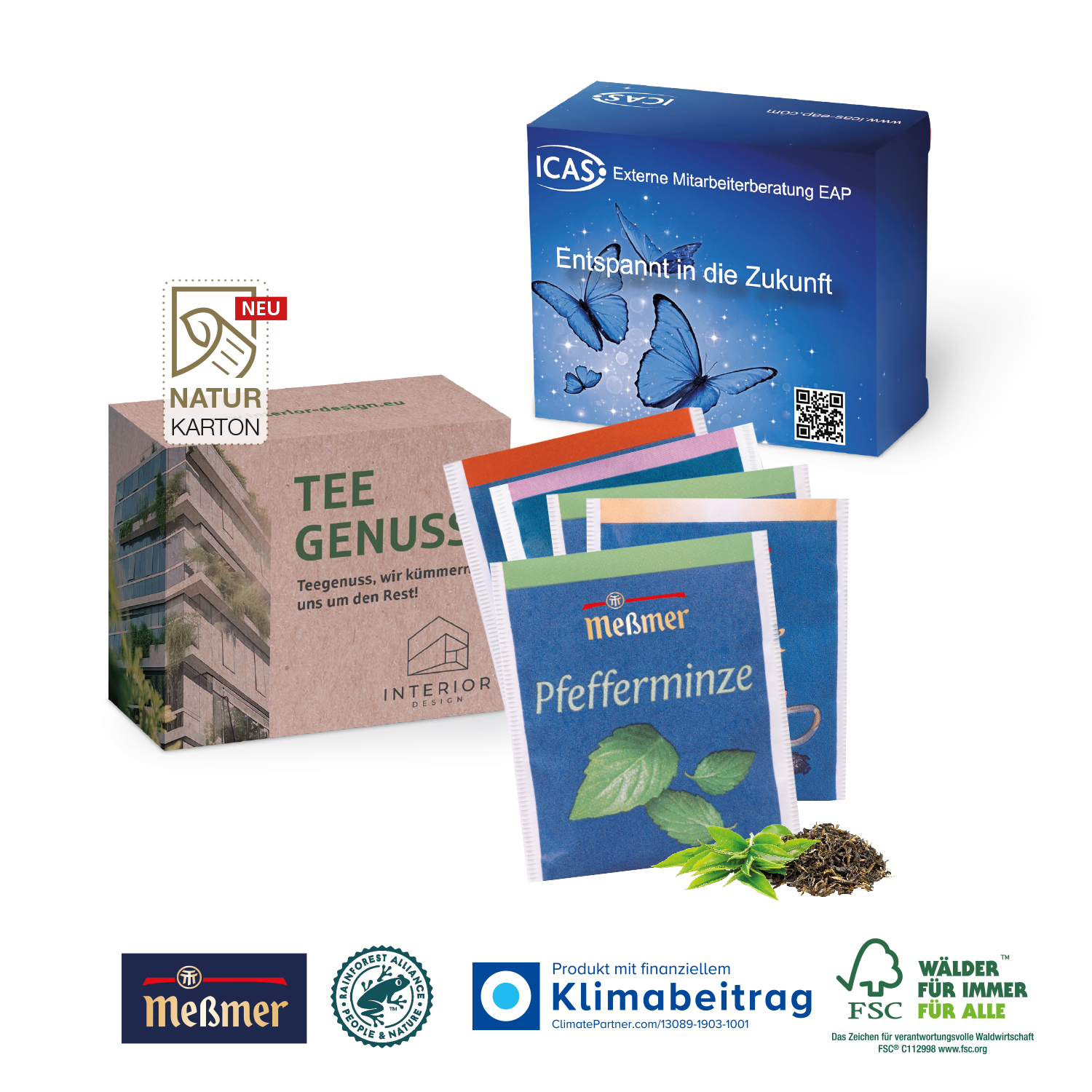 5 Teebeutel von Meßmer, einzeln in Aromaschutzverpackung. Geschmacksrichtungen nach Wunsch und Verfügbarkeit, bunt gemischt, z. B. "Energie", "Detox your feelings", "Entspannung", "Pfefferminze" oder "Matcha Spirit".