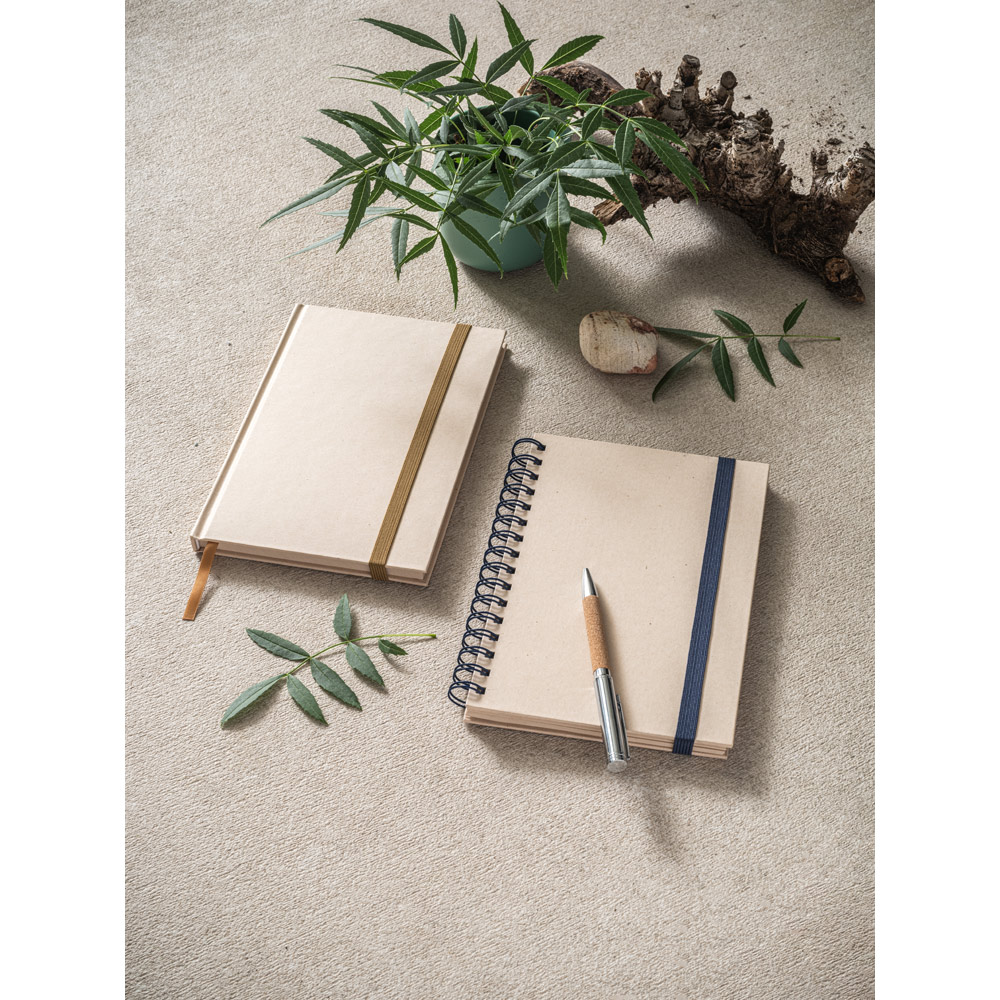 A5 Notizbuch mit Ringen, fester Einband, aus Zuckerrohrpapier (80% zuckerrohr). Enthält 160 unbedruckte Seiten aus Zuckerrohrpapier (80 % zuckerrohr) (90 g / m²) und ein Gummiband zum Schließen des Notizbuchs. 147 x 214 mm