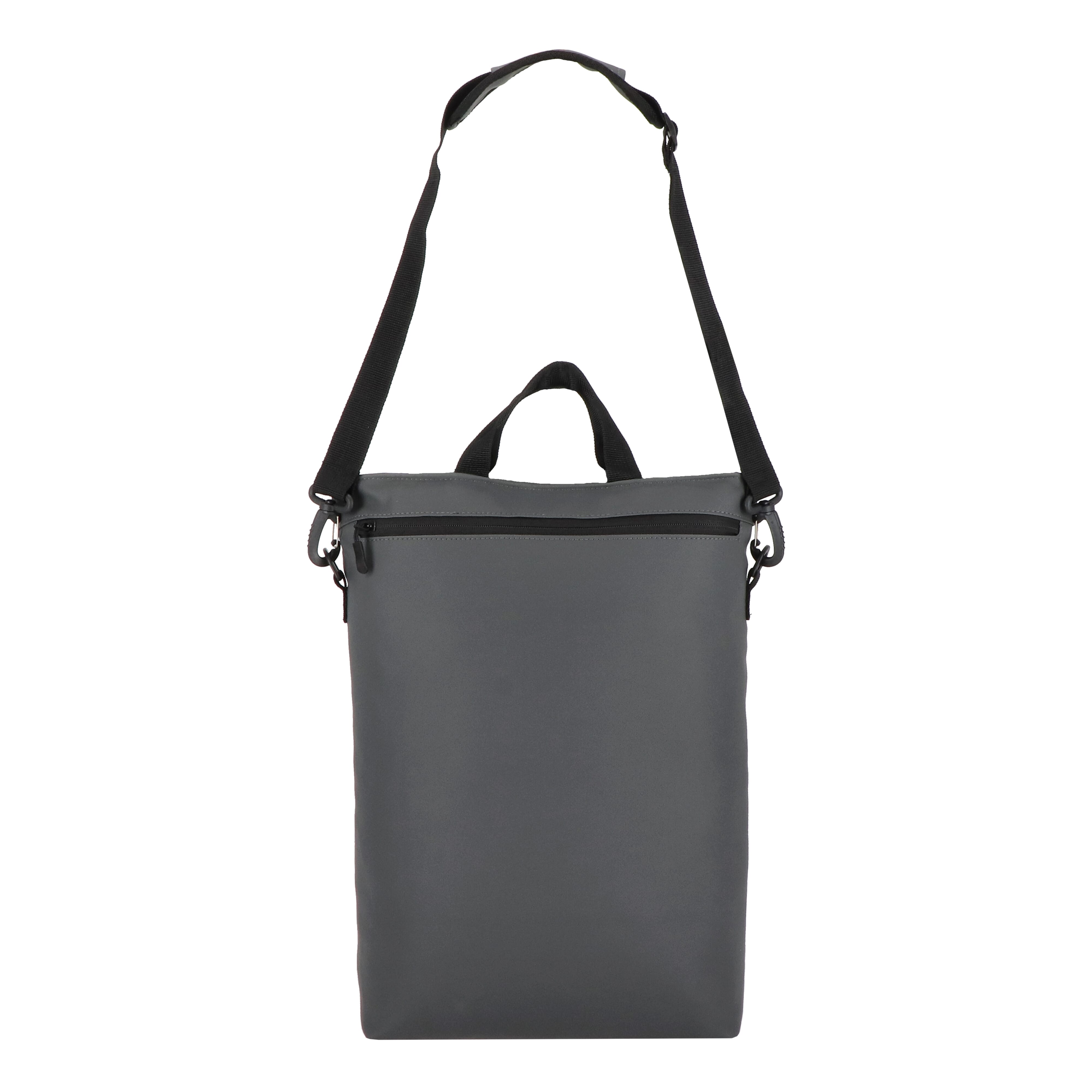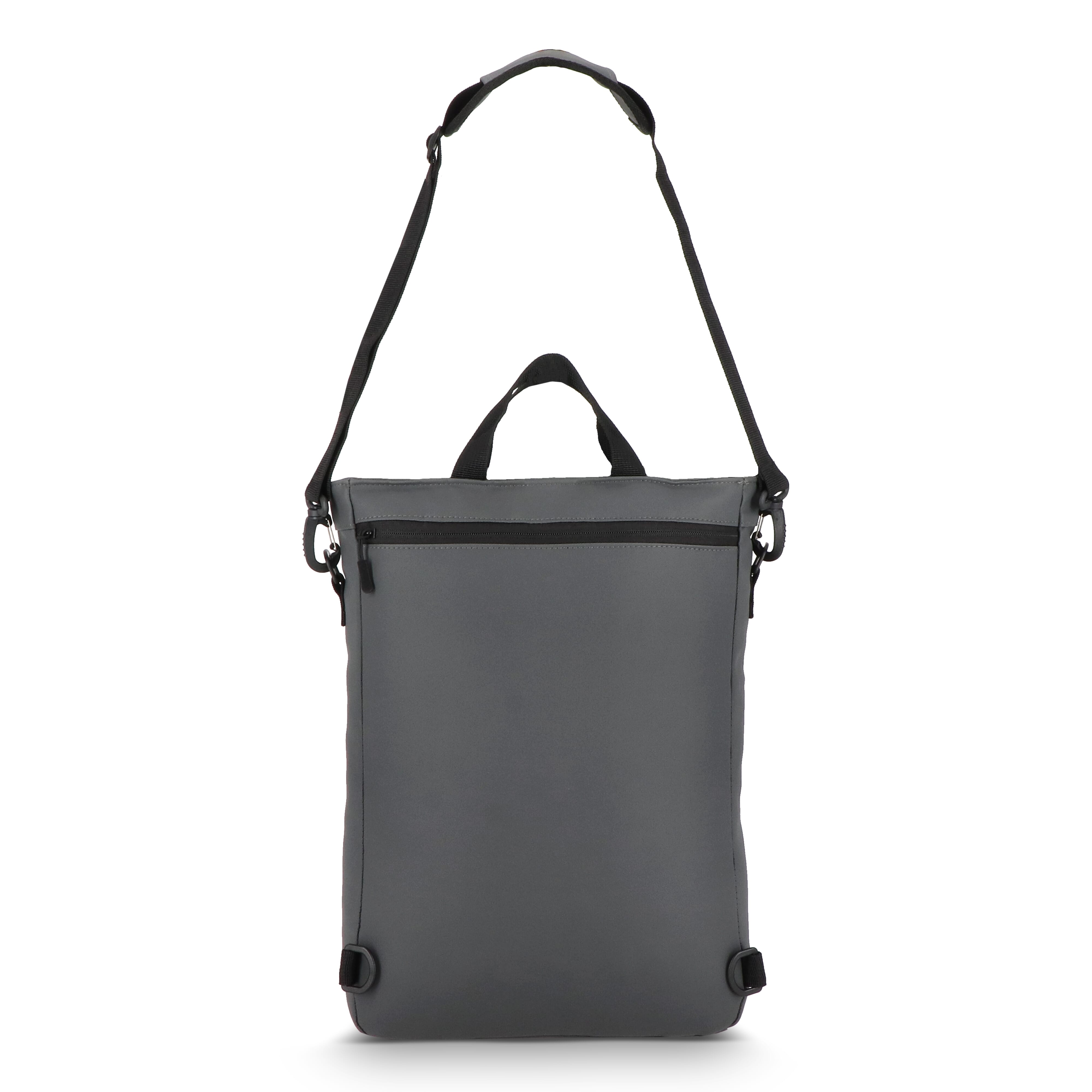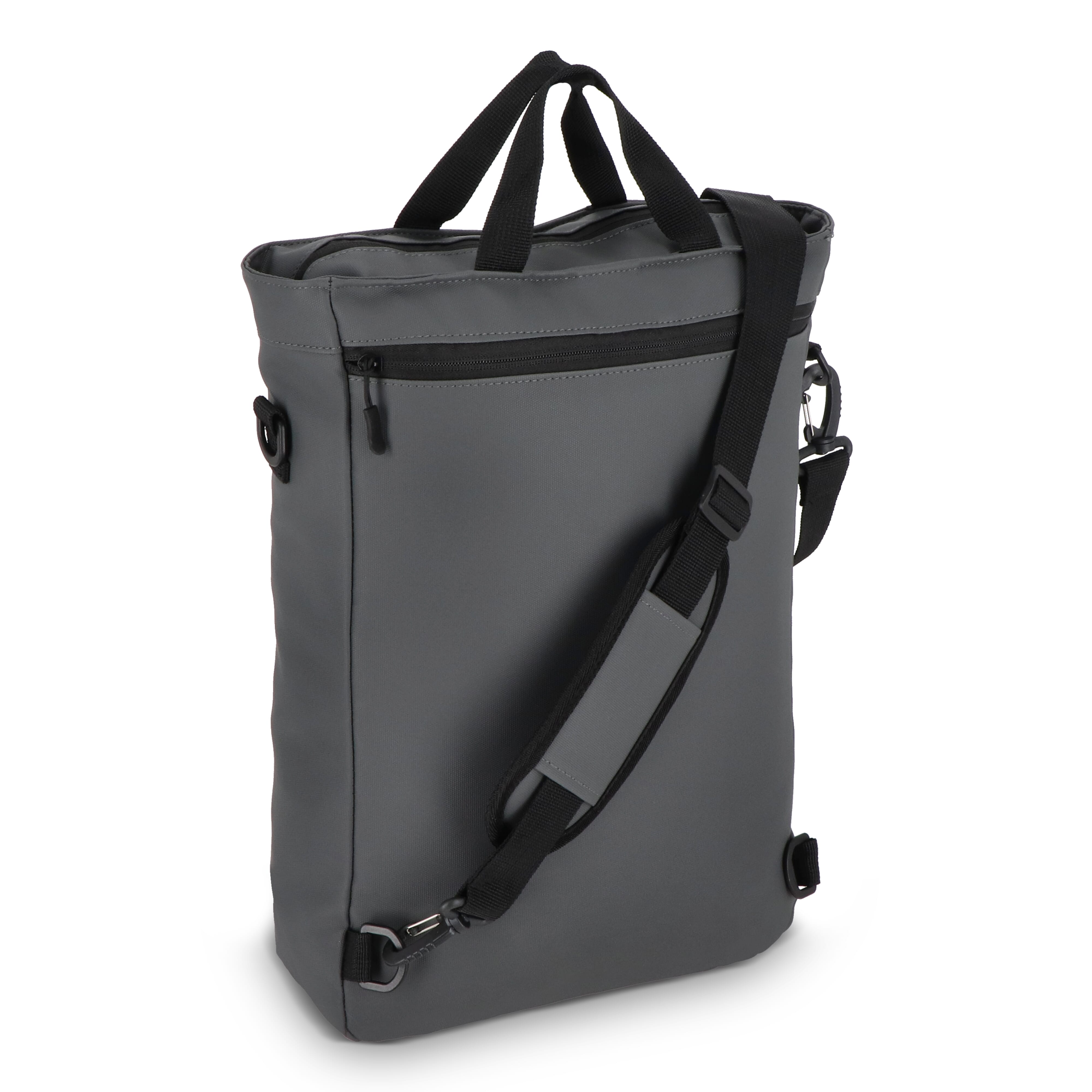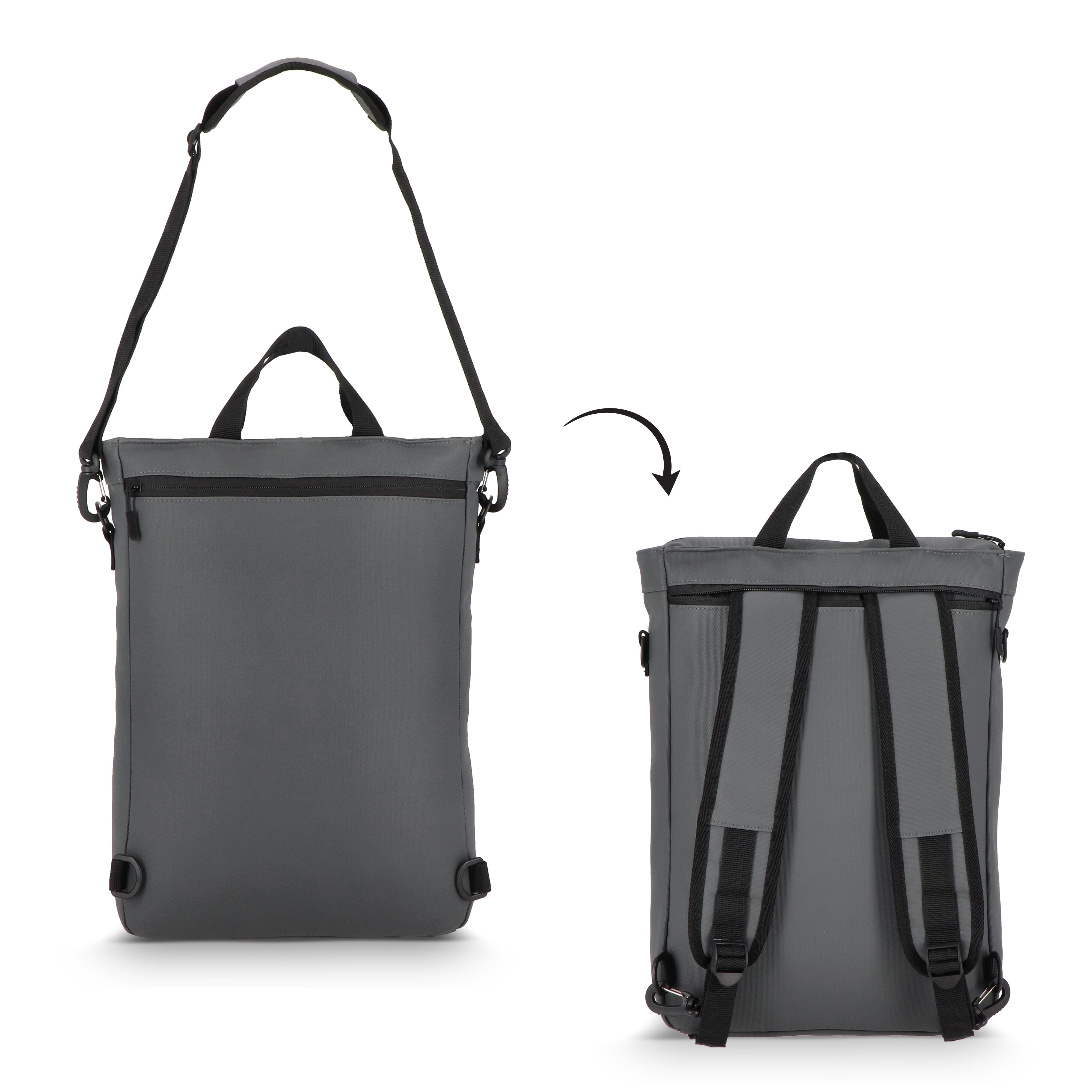 Wandelbarer PU-Laptop-Rucksack mit 210D-Futter für 15,6-Zoll-Laptops. Kann als Rucksack oder Umhängetasche getragen werden. Mit Fronttasche mit Reißverschluss, gepolstertem Laptopfach und Innenorganizer.