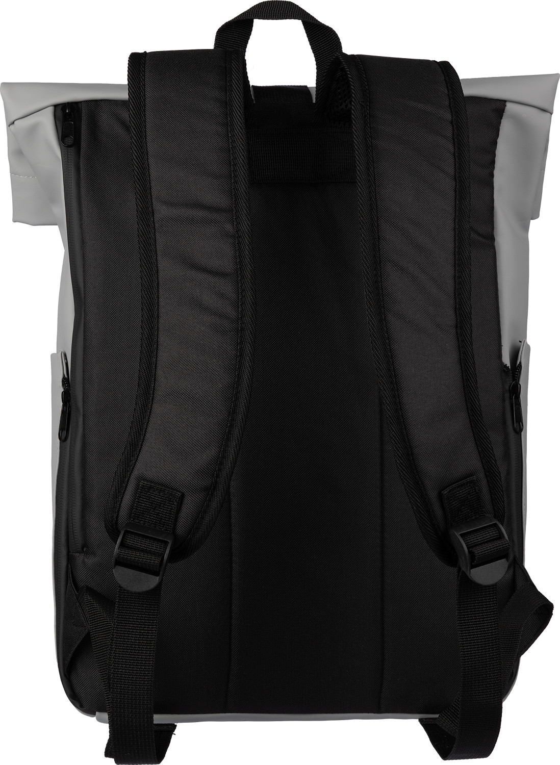 Rucksack aus PU-Leder mit PU-Futter (210D) und PE-Schaumstoffunterlage (5 mm). Enthält ein Laptopfach (15 Zoll) und eine Reißverschlusstasche auf der Vorderseite.