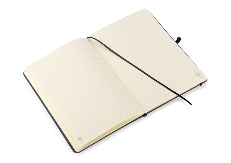 Das Notizbuch GLITZO hat 80 karierte Seiten aus recyceltem Material, ein kompaktes A5-Format und einen festen Einband aus recyceltem PU. Verschlossen wird das Produkt mit einem praktischen Gummiband, damit die Notizen sicher aufbewahrt werden können. Ein Band, das als Lesezeichen dient, ermöglicht es Ihnen, schnell wieder zu finden, wo Sie aufgehört haben. Außerdem bietet das Notizbuch Platz für einen Stift, was es noch funktionaler macht.