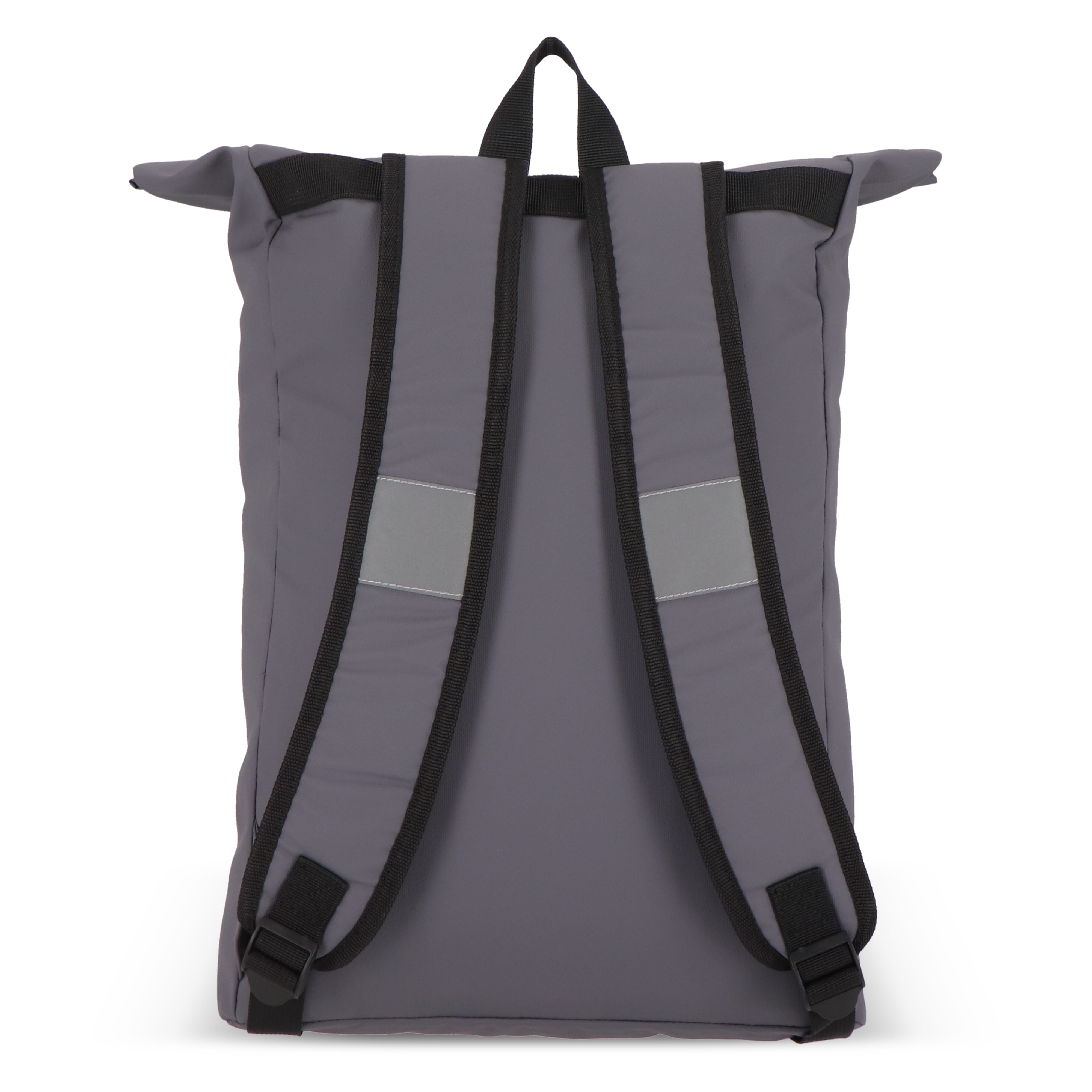 Dieser Rolltop-Rucksack ist aus PU-beschichtetem, recyceltem PET aus 600D-Material gefertigt. Er verfügt über reflektierende Streifen an den Schultergurten und um das vordere Reißverschlussfach herum, was die Sicherheit beim Pendeln im Dunkeln erhöht. Sie verfügt über einen Tragegriff, verstellbare, gepolsterte Schultergurte und ein gepolstertes Laptop-Fach im Inneren.