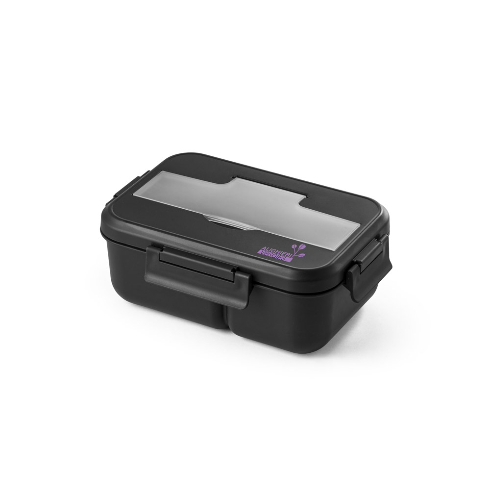 Frischhaltebox (bis 1 L) aus PP. Der Deckel hat einen Einsatz für das Besteck (dieser ist im Lieferumfang enthalten). Für Mikrowellengebrauch den Deckel abnehmen. Nicht für Flüssigkeiten geeignet. 210 x 145 x 80 mm