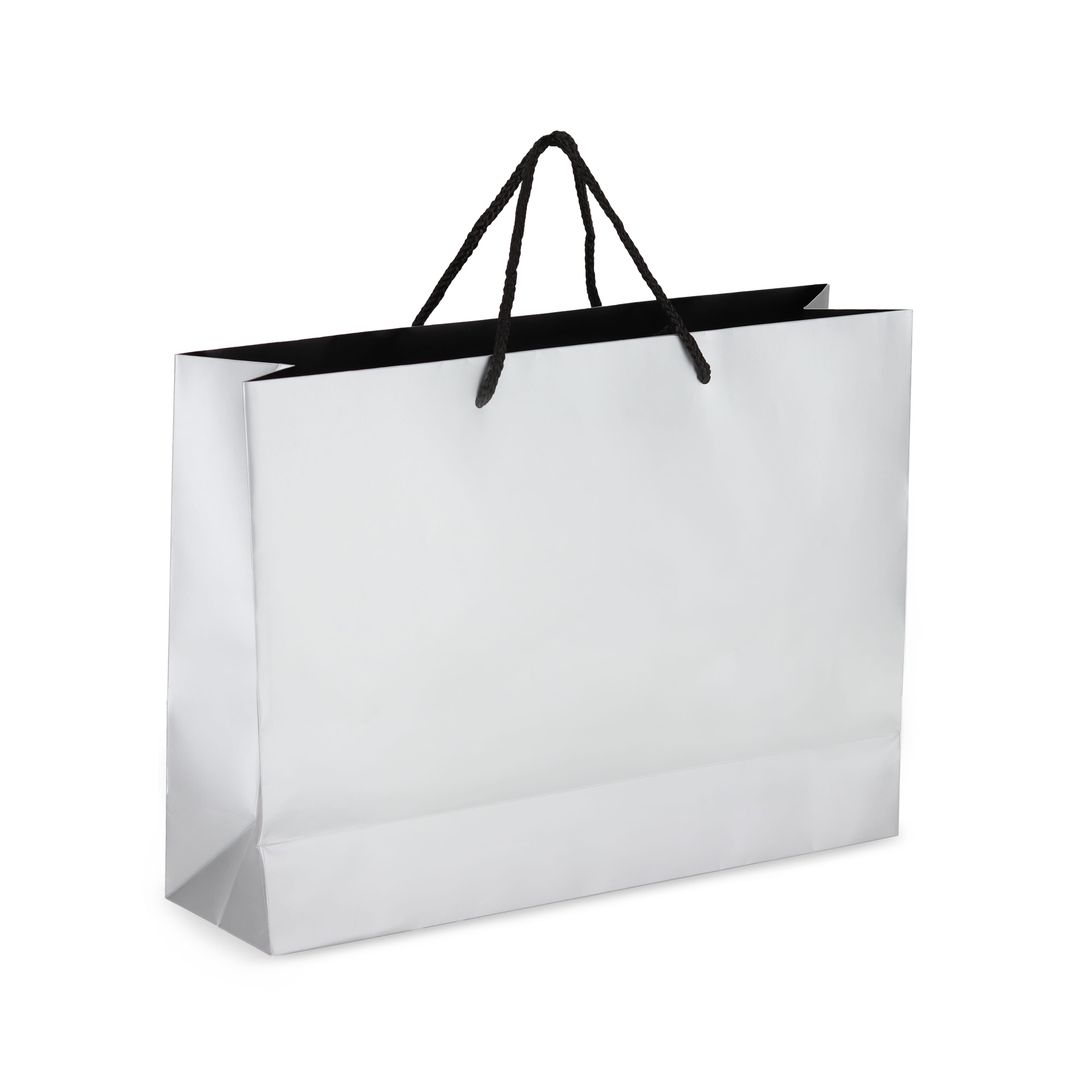 Elegante Geschenktasche aus Papier mit 5 mm dicken Kordeln aus recyceltem Polyester. Sie ist für ein Gewicht von bis zu 5 kg ausgelegt und hat ein luxuriöses Aussehen mit schwarzen Griffen und einer schwarzen Innenseite. Perfekt zum Überreichen von Geschenken.