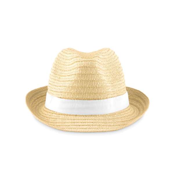 Hut aus Papierstroh im Natur-Look mit farbigem Polyester-Band. Bei Bestellungen ohne Werbeanbringung wird das Band lose mitgeliefert.