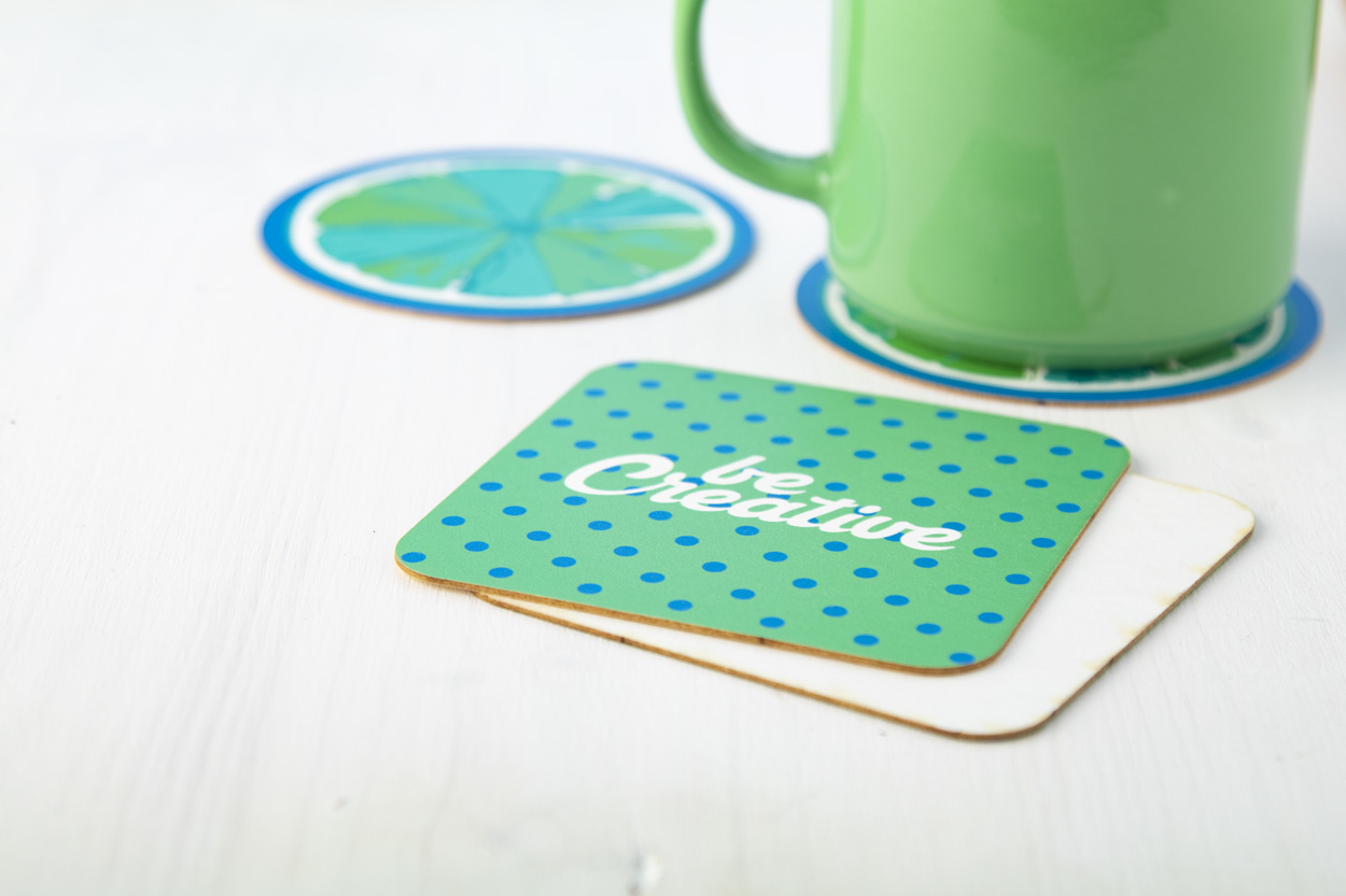 Individueller, saugfähiger Papier-Untersetzer mit individuellem Druckmotiv auf einer Seite. Mindestmenge: 250 Stk.
