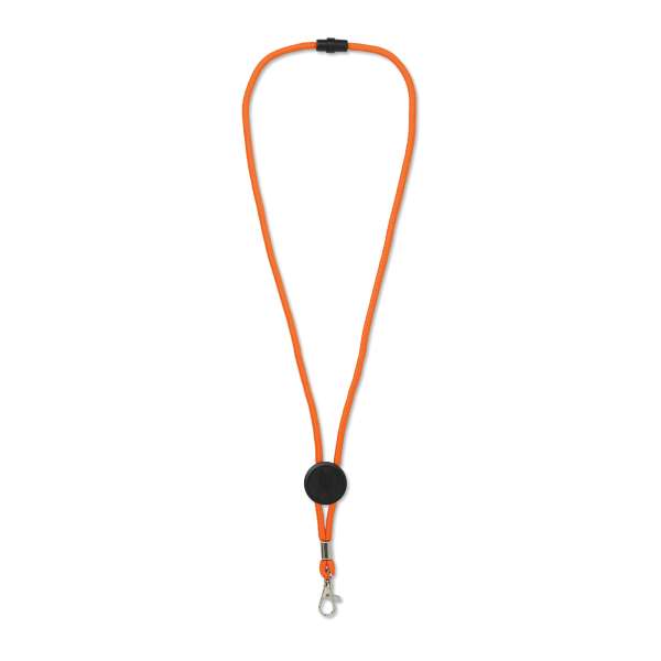 Lanyard aus Paracord mit Kunststoff Sicherheitsverschluss und Metallhaken. Das Lanyard ist verstellbar durch ein Kunststoff Plättchen, das mittels Doming veredelt werden kann.