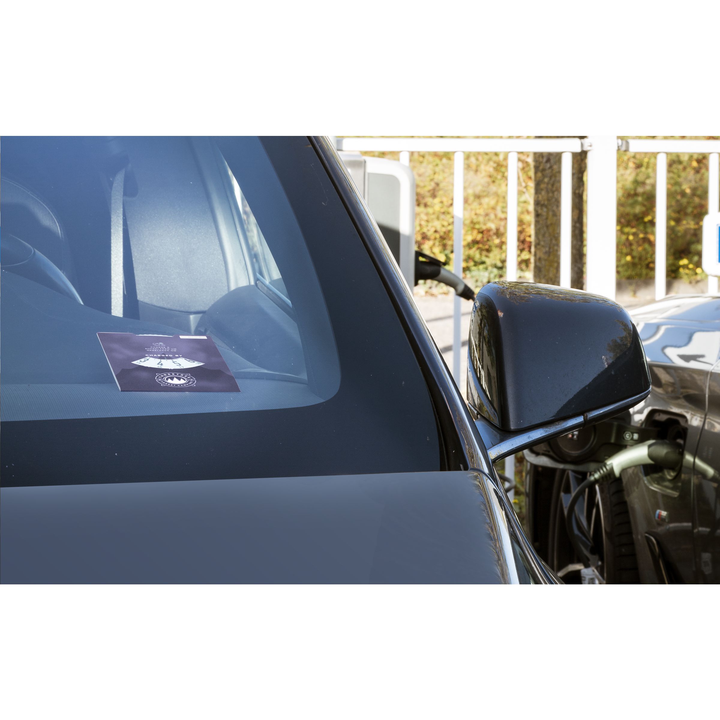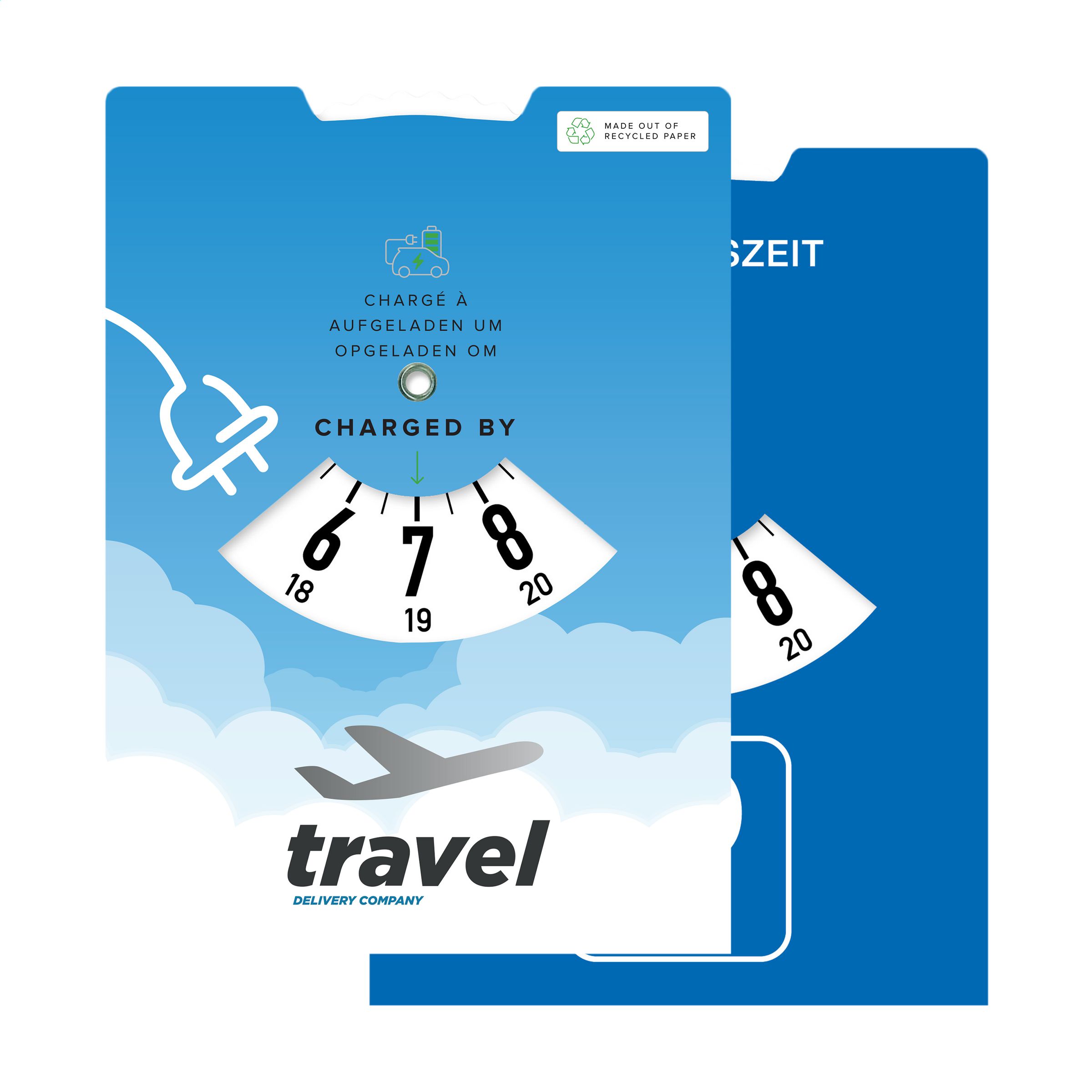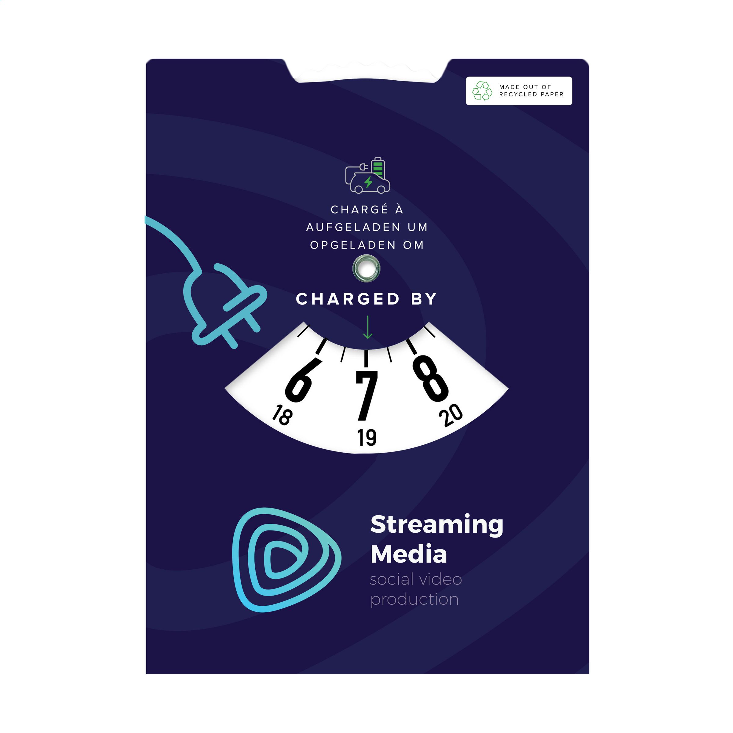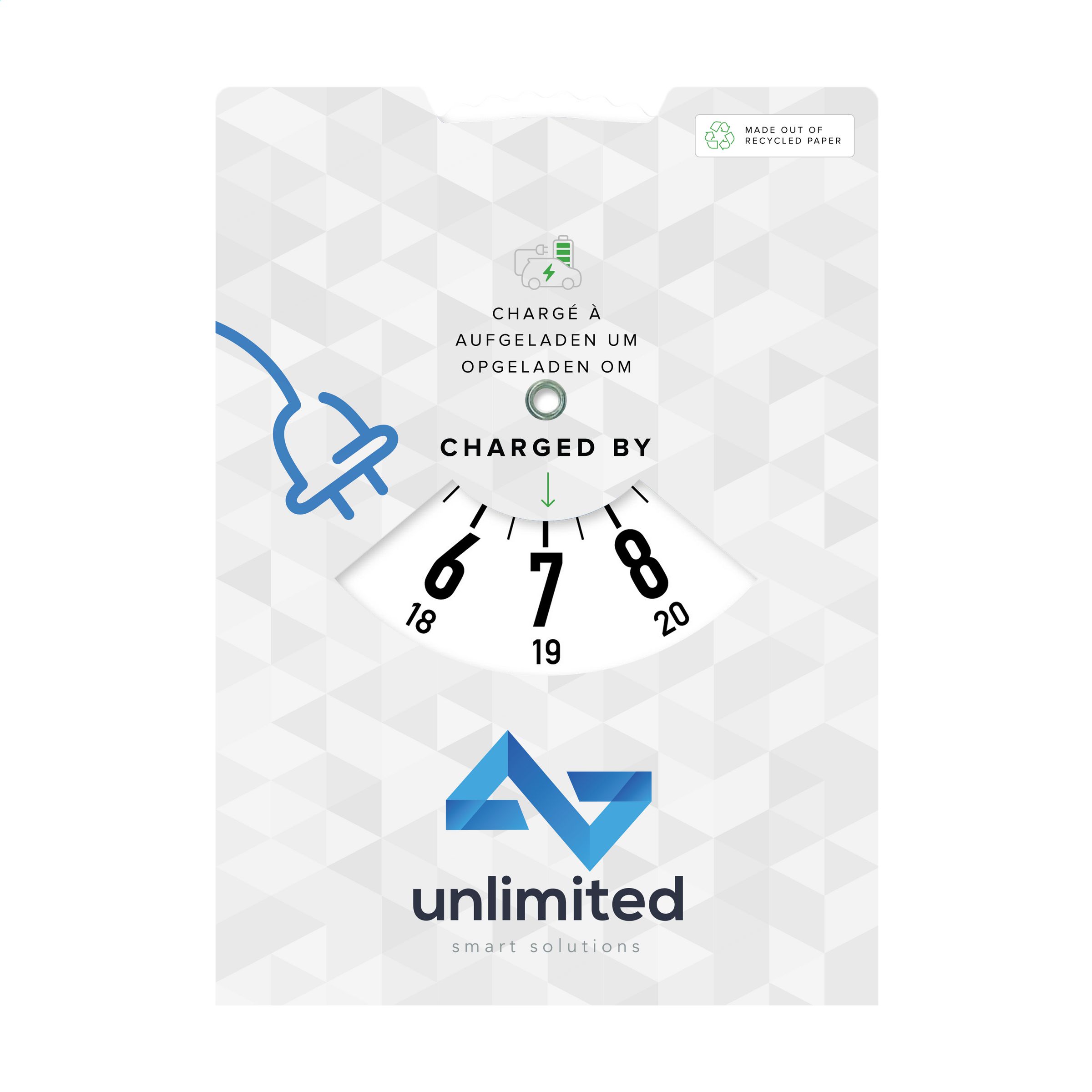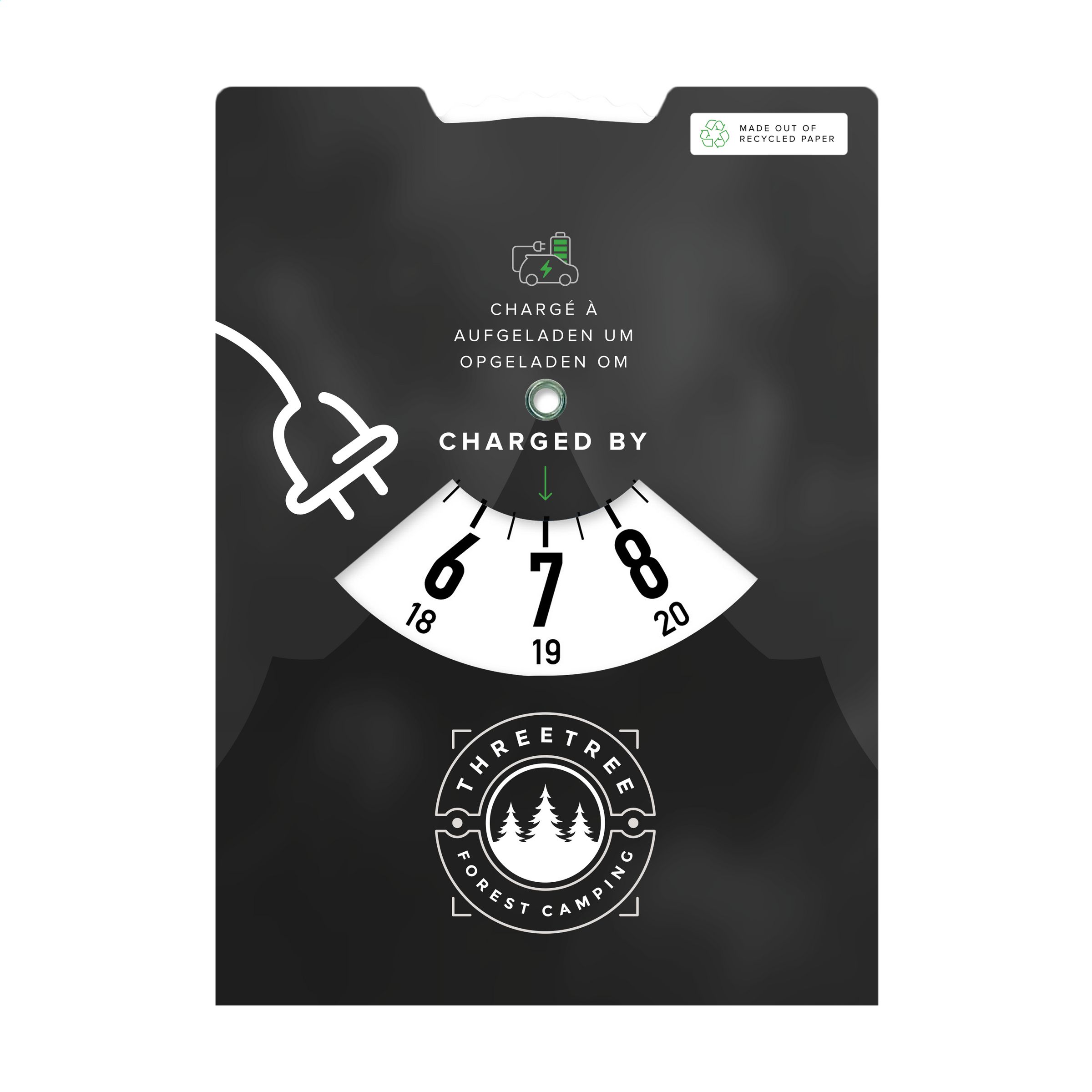 WoW! Parkscheibe und Ladescheibe in einem. Geeignet für Elektroautos. Auf einer Seite befindet sich eine Ladescheibe mit Ladezeitanzeige. Diese Seite können Sie verwenden, wenn Sie Ihr Elektroauto an einer öffentlichen Ladestation aufladen. So teilen Sie anderen Fahrern von Elektrofahrzeugen mit, wann die Batterie Ihres Fahrzeugs ausreichend geladen ist. Auf diese Weise weiß jeder, wann die Ladestation freigegeben wird – und alle können die öffentlichen Ladestationen optimal nutzen. Auf der anderen Seite befindet sich eine normale Parkscheibe für blaue Zonen. Die Scheibe ist aus recyceltem Papier gefertigt und der Text ist in mehreren Sprachen verfasst. Inklusive Vollfarbdruck auf der Seite "Ladescheibe". Made in Germany.