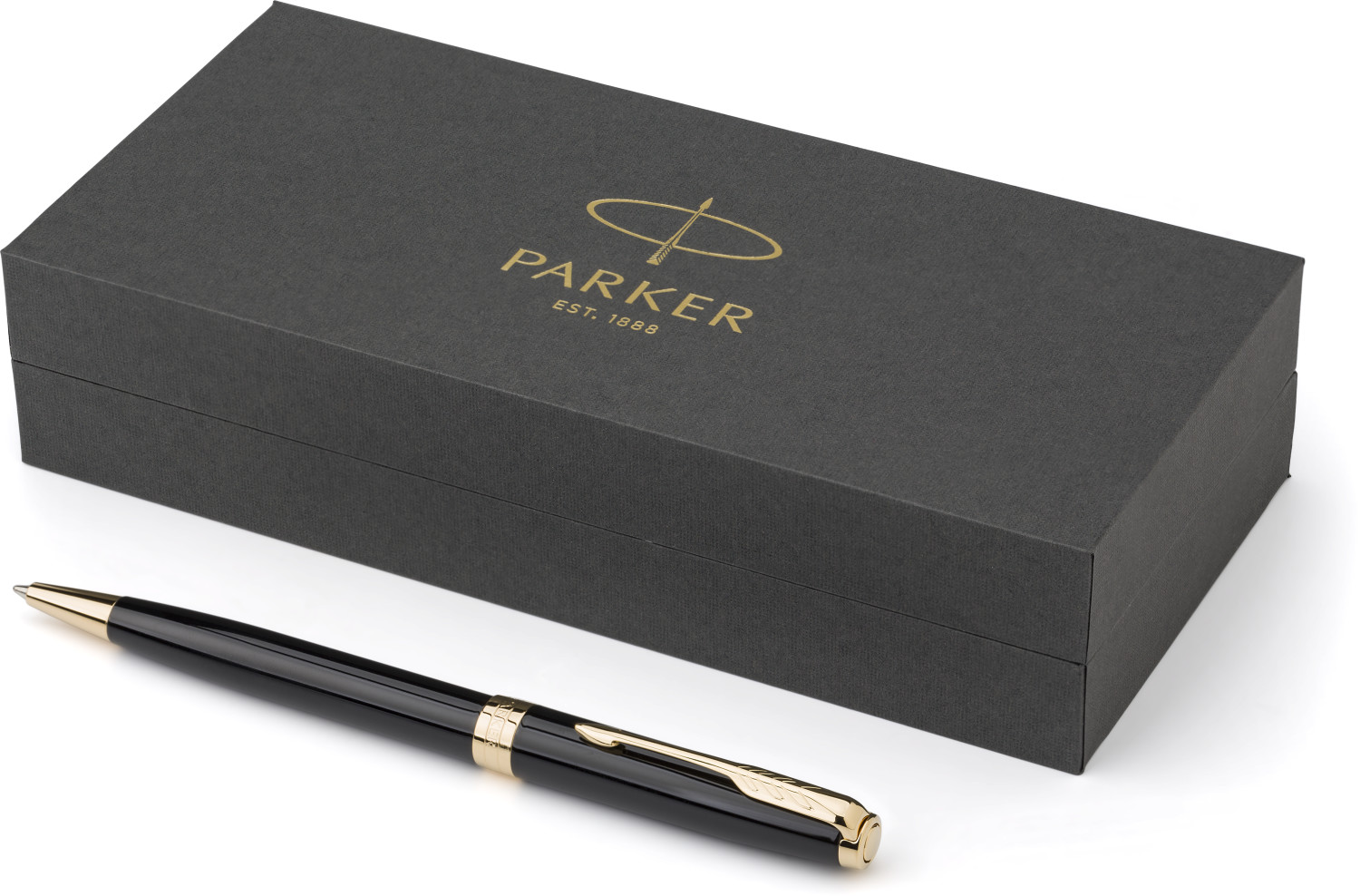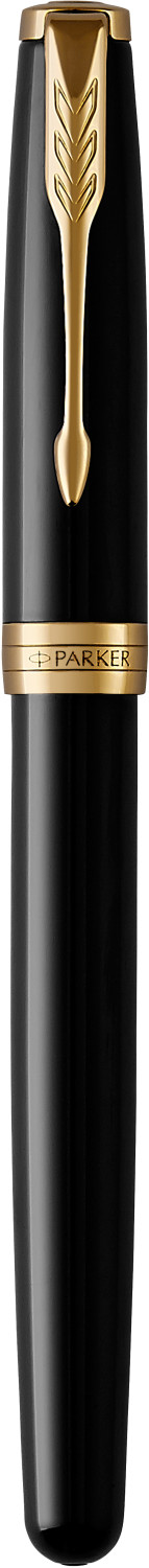 Parker Drehkugelschreiber Sonnet Schaft und Kappe aus Edelstahl, akzentuiert durch Clip und Zierleiste in Goldoptik. Schreibfarbe: schwarz. Verpackt in einer Geschenkbox.
