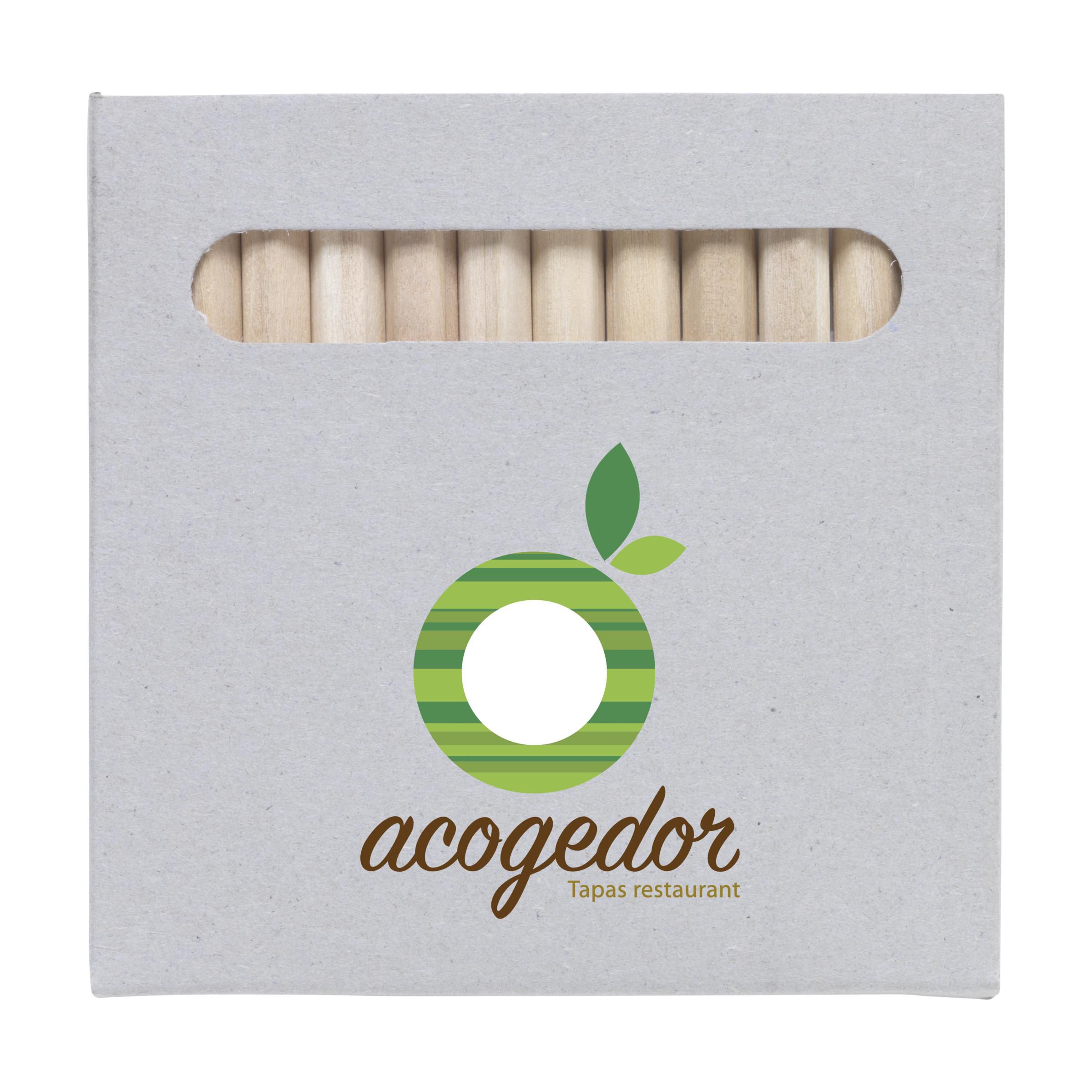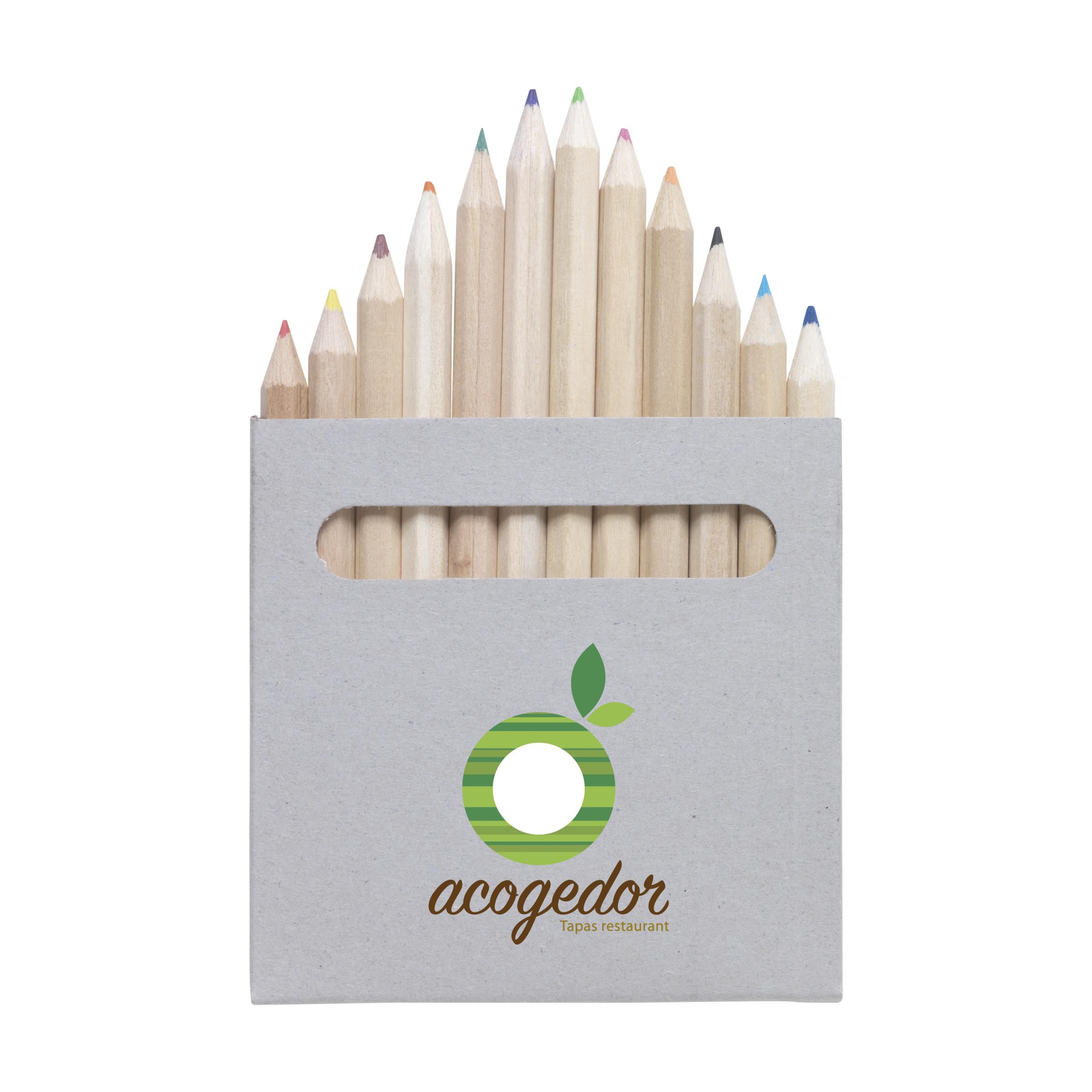 12 hölzerne, unlackierte, angespitzte Buntstifte in einem Karton aus Recyclepapier.