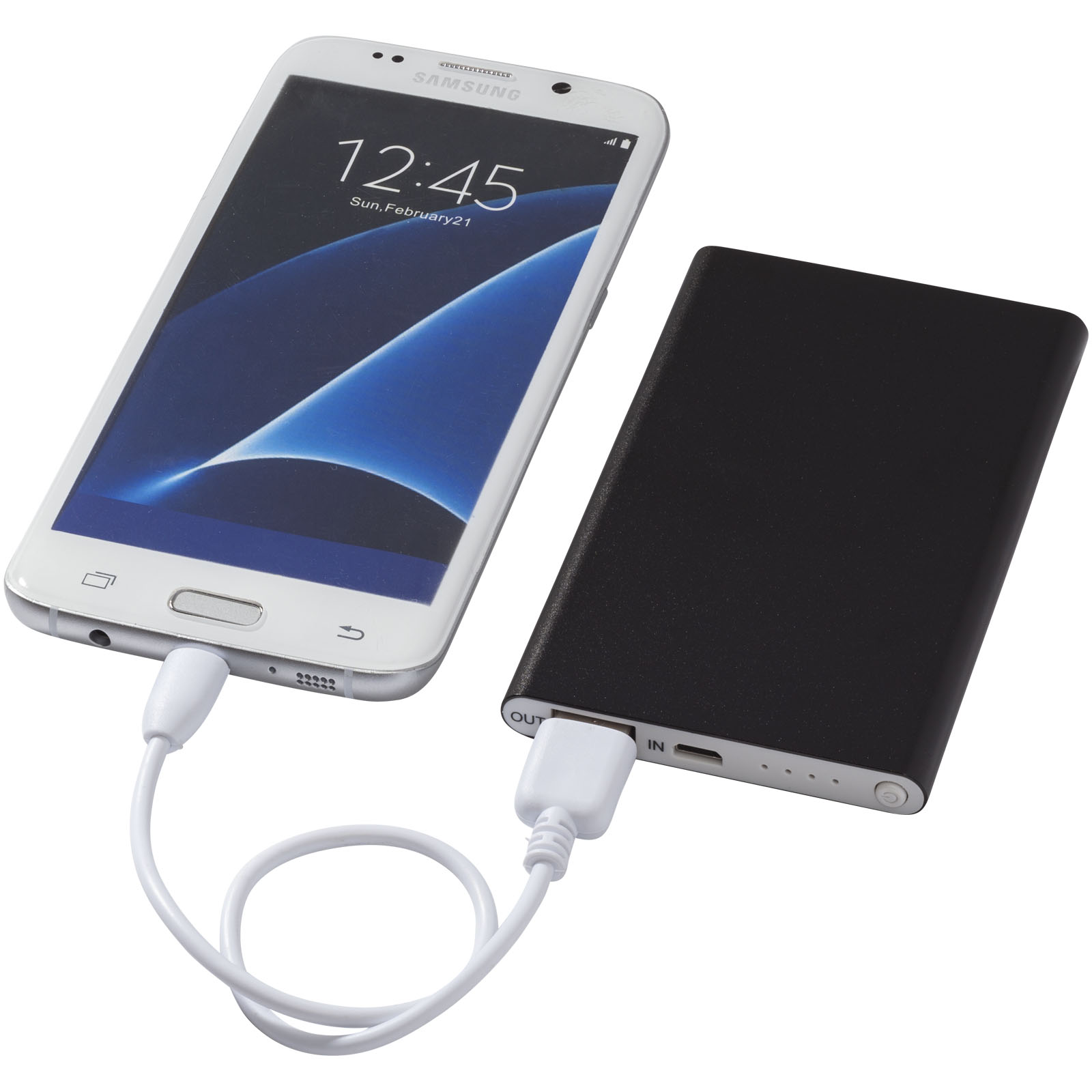 Diese schlanke und leichte Aluminium-Powerbank enthält einen Lithium-Polymer-Akku der Klasse A und hat eine Kapazität von 4000 mAh. Die LED Anzeigen leuchten während des Aufladens auf und zeigen die restliche Akkukapazität in der Powerbank an. Die Powerbank hat einen 5 V/1 A Eingang und einen 5 V/1 A Ausgang. Im Lieferumfang enthalten ist ein Ladekabel vom Typ-C auf USB-A. Metalleffektlack. Verpackt in einer weißen Geschenkbox.