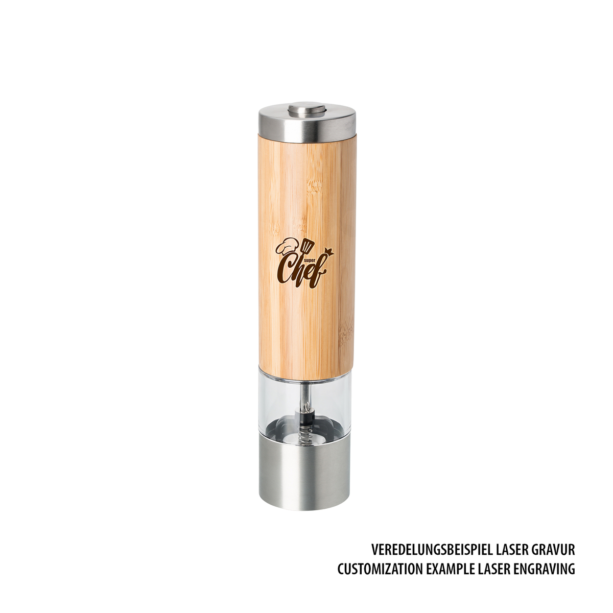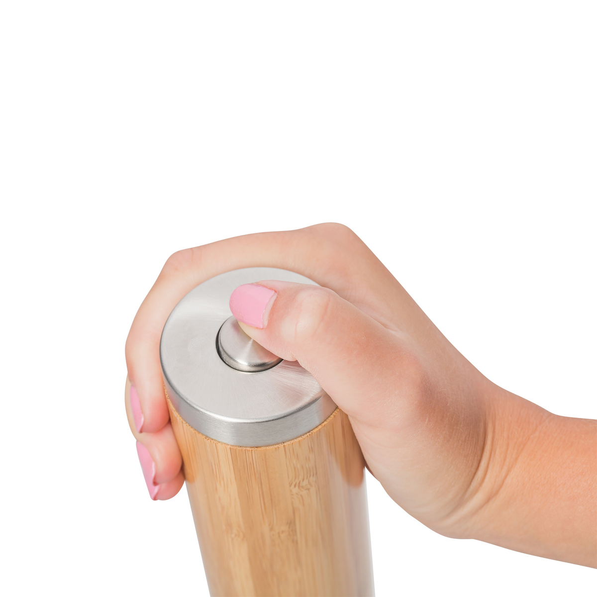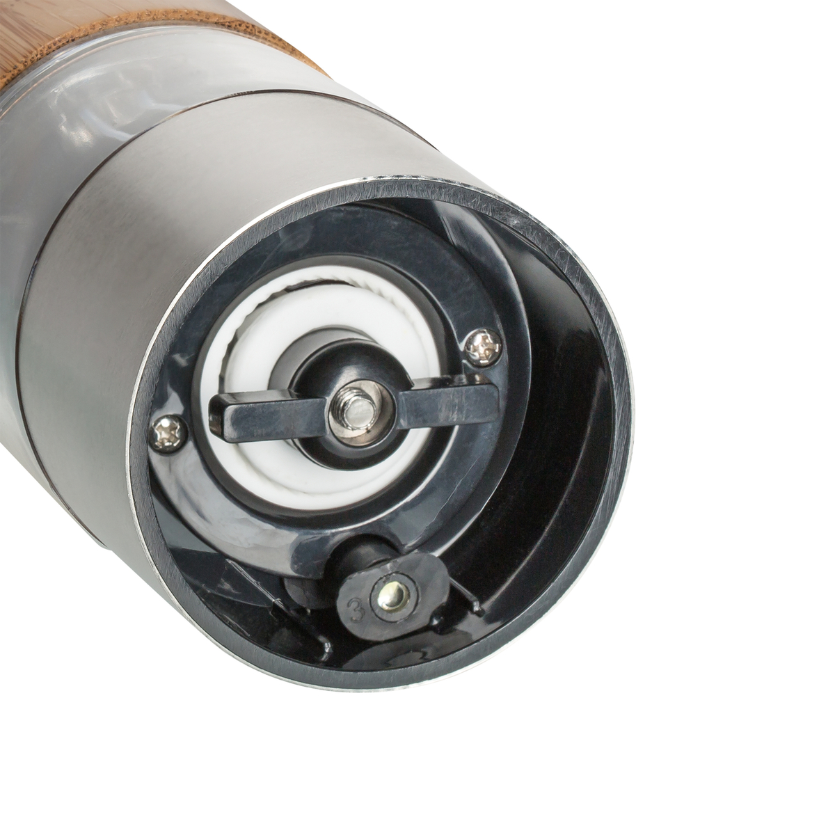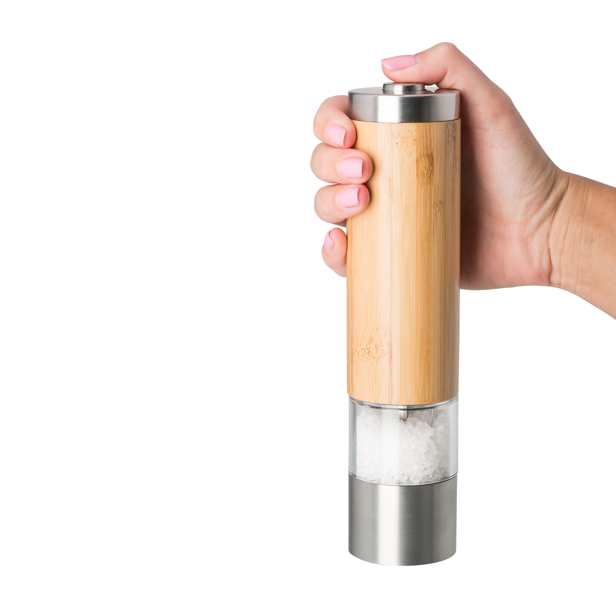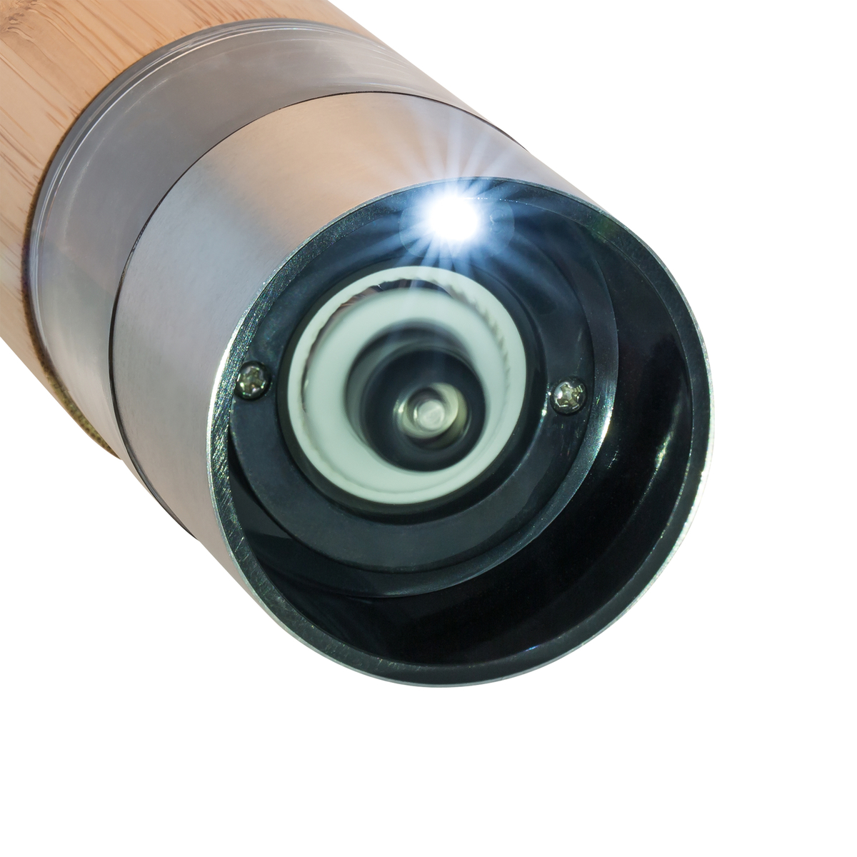 Die elektrische Gewürzmühle aus einem Materialmix aus nachhaltigem Bambus und hochwertigem Edelstahl hat ein verstellbares Keramikmahlwerk. So können Sie selbst entscheiden, wie fein oder grob gemahlen werden soll. Eine eingebaute LED unterstützt bei der präzisen Einschätzung der Dosiermenge auf dem Würzgut.