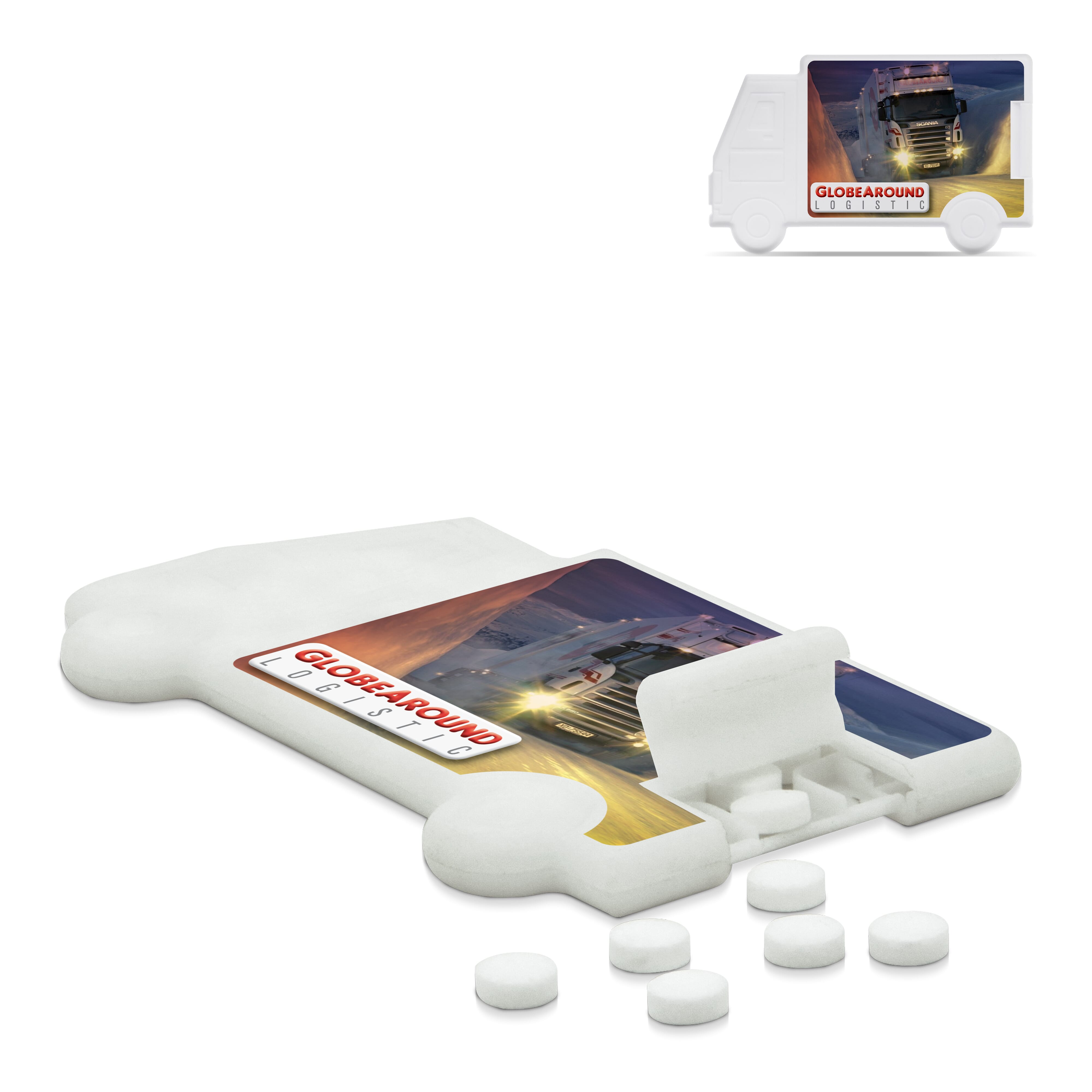 Pfefferminzdose in LKW-Form, die Öffnung befindet sich an der Rückseite des LKW. Ca. 7g zuckerfreies Pfefferminz. Die Oberfläche kann vollfarbig digital bedruckt werden. Die Produktspezifikationen befinden sich auf der Rückseite der Dose.