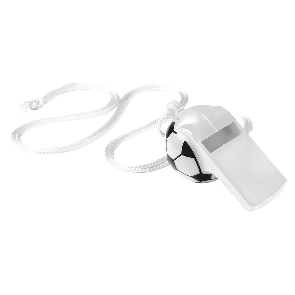 Traditionelle Trillerpfeife aus Kunststoff mit Fußball-Aufdruck und Kordel zum Umhängen.