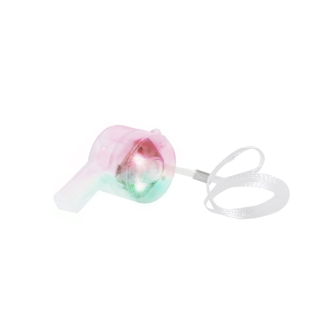 Leuchtpfeife mit mehrfarbigen LEDs, die mehrere Beleuchtungsmodi bietet: langsames, mittleres oder schnelles Blinken, angepasst an verschiedene Umgebungen. Inklusive praktischem Ein / Aus-Schalter. Inklusive Kordel für bequemen Transport und funktioniert mit drei Knopfzellen (inbegriffen).