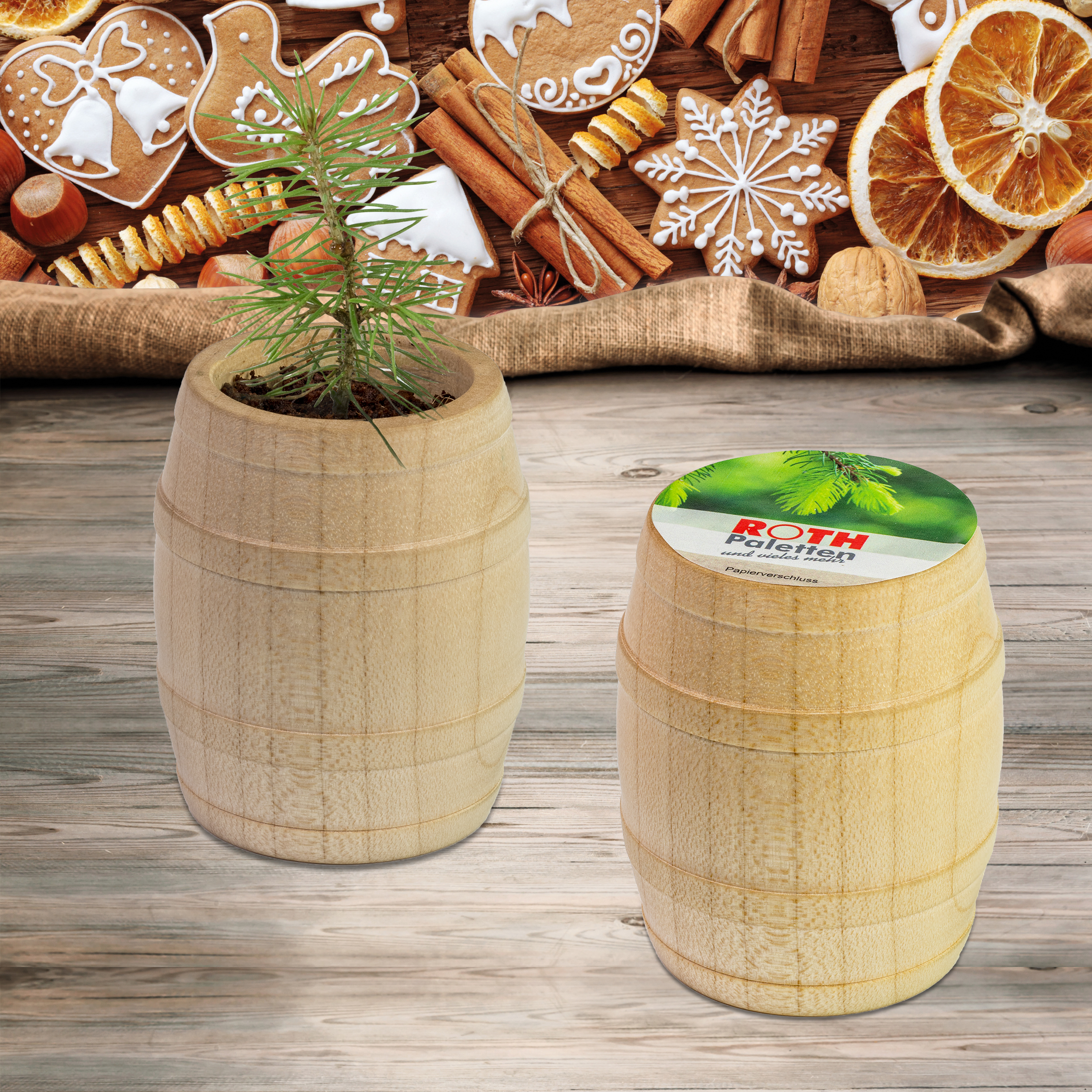 Dieses besondere Fässchen aus europäischem Holz wird gefüllt mit einer Substrattablette als Erde, Samen nach Wahl und Pflanzanleitung geliefert. Mit dem individuell gestalteten Papieraufkleber als Deckel bringen Sie Ihre Werbebotschaft ins Rollen. Optional ist eine Lasergravur auf dem Gefäß möglich.