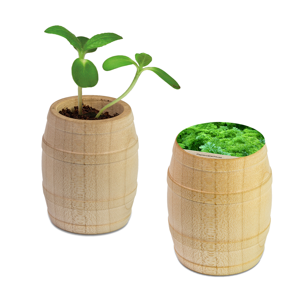 Dieses besondere Fässchen aus europäischem Holz wird gefüllt mit einer Substrattablette als Erde, Samen nach Wahl und Pflanzanleitung geliefert. Mit dem individuell gestalteten Papieraufkleber als Deckel bringen Sie Ihre Werbebotschaft ins Rollen. Optional ist eine Lasergravur auf dem Gefäß möglich.