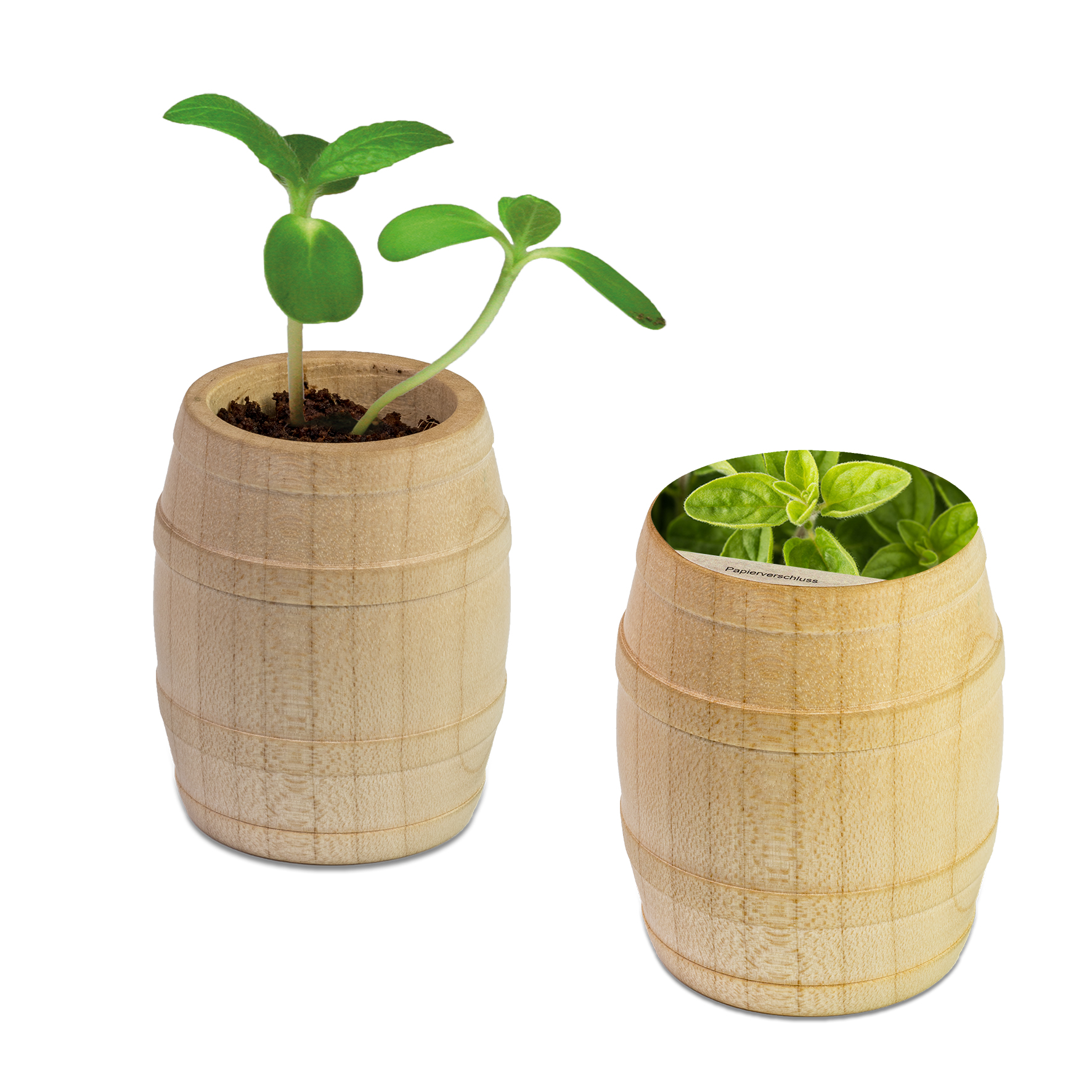 Dieses besondere Fässchen aus europäischem Holz wird gefüllt mit einer Substrattablette als Erde, Samen nach Wahl und Pflanzanleitung geliefert. Mit dem individuell gestalteten Papieraufkleber als Deckel bringen Sie Ihre Werbebotschaft ins Rollen. Optional ist eine Lasergravur auf dem Gefäß möglich.