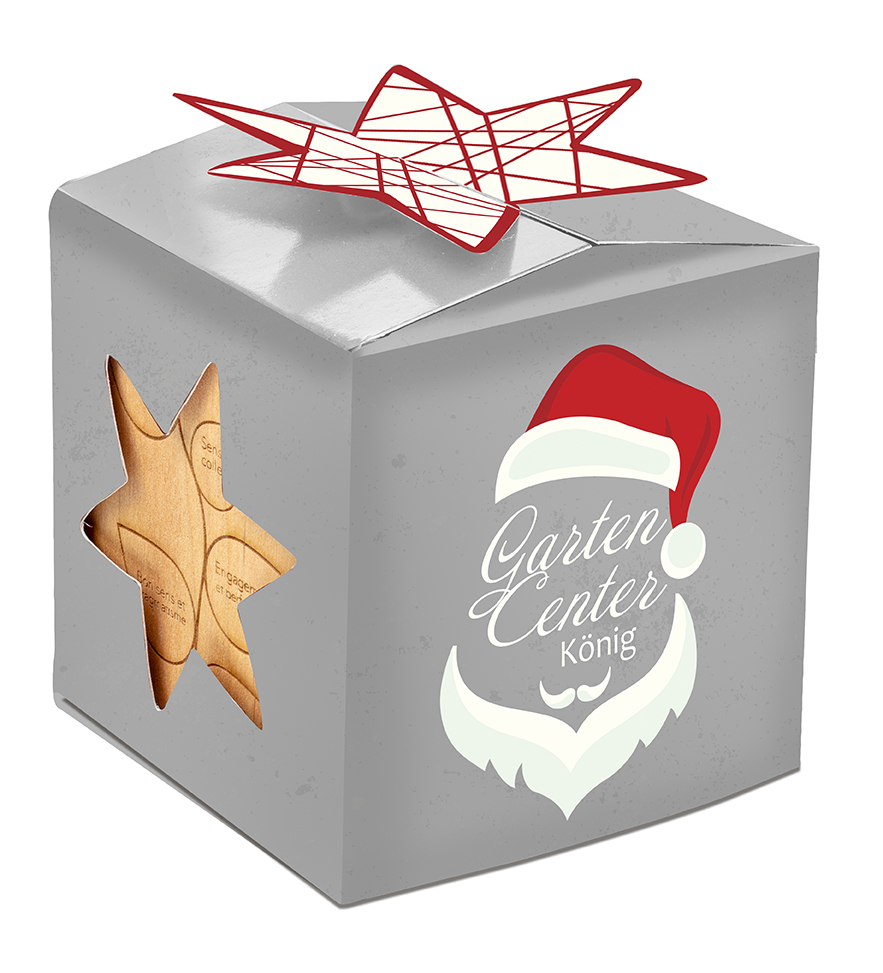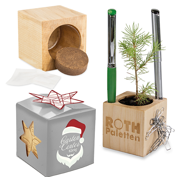 Ein neuer Star ist geboren. Das beliebte Werbegeschenk Pflanz-Holz Büro, ist für Weihnachten in der neu-designten Star-Box erhältlich. Diese hochwertige Verpackung mit adventlichem Sternenverschluss verleiht dem Weihnachtspräsent einen exklusiven Charakter. Darin enthalten ist das beliebte Pflanz-Holz Büro aus europäischem Holz, Fichtensamen und Substrattablette als Erde. Der Mini-Blumentopf bietet zudem die Aufbewahrung von Stiften und Büroklammern am Magnet. Die Star-Box ist auf allen Seiten individuell bedruckbar und durch die Aussparungen in Sternenform kann man das Geschenk bereits erahnen – so wird die Neugier des Beschenkten geweckt. Das Pflanz-Holz selbst kann mit einem Logo lasergraviert werden.