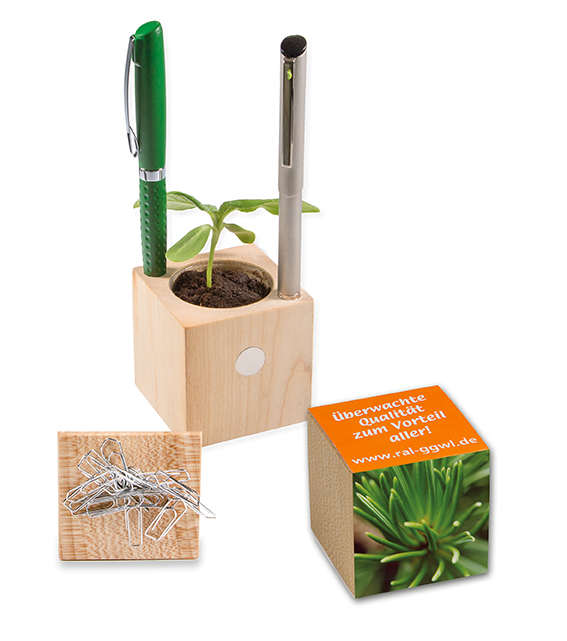 Ein maximales Naturerlebnis bietet der große Holz-Würfel auseuropäischem Holz, gefüllt mit einer Substrattablette als Erde und Fichtensamen. Die Banderole kann komplett individuell gestaltet werden und eine mögliche Lasergravur auf dem Holz bietet permanente Werbewirkung im Büro oder bei Ihren Kunden zuhause. Der Würfel bietet sich nicht nur als Töpfchen an, sondern auch als idealer Stifte-Halter und durch den seitlich angebrachten Magneten finden auch z. B. Büroklammern Platz.