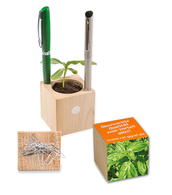 Ein maximales Naturerlebnis bietet der große Würfel aus europäischem Holz für das Saatgut und Ihre Werbung. Dieser wird mit beliebigem Samen und einer Substrattablette als Erde geliefert und fordert den Empfänger als Hobbygärtner heraus. Zusätzlich bietet sich der Blumentopf als Stiftehalter an und auf dem seitlich angebrachten Magneten finden auch z. B. Büroklammern Platz. Ihre Werbung ist auf der umliegenden Banderole und optional als Lasergravur auf dem Gefäß möglich. Ein Blickfang auf jedem Schreibtisch und das werbende Unternehmen bleibt in Erinnerung.