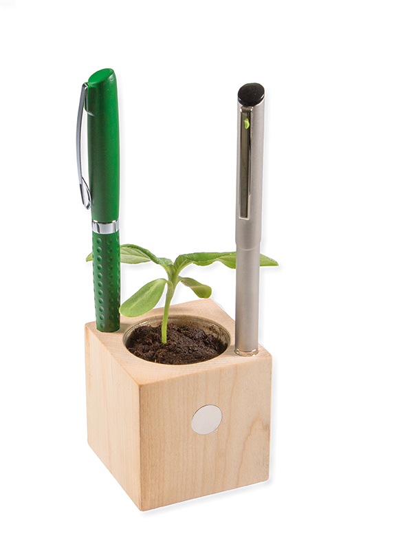 Ein maximales Naturerlebnis bietet der große Würfel aus europäischem Holz für das Saatgut und Ihre Werbung. Dieser wird mit beliebigem Samen und einer Substrattablette als Erde geliefert und fordert den Empfänger als Hobbygärtner heraus. Zusätzlich bietet sich der Blumentopf als Stiftehalter an und auf dem seitlich angebrachten Magneten finden auch z. B. Büroklammern Platz. Ihre Werbung ist auf der umliegenden Banderole und optional als Lasergravur auf dem Gefäß möglich. Ein Blickfang auf jedem Schreibtisch und das werbende Unternehmen bleibt in Erinnerung.