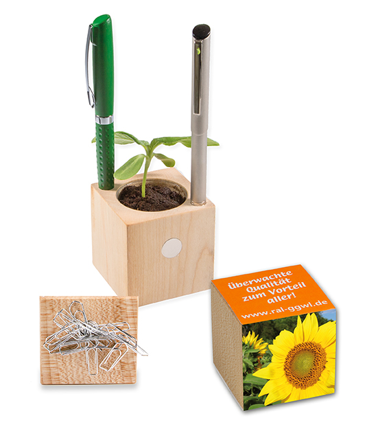 Ein maximales Naturerlebnis bietet der große Würfel aus europäischem Holz für das Saatgut und Ihre Werbung. Dieser wird mit beliebigem Samen und einer Substrattablette als Erde geliefert und fordert den Empfänger als Hobbygärtner heraus. Zusätzlich bietet sich der Blumentopf als Stiftehalter an und auf dem seitlich angebrachten Magneten finden auch z. B. Büroklammern Platz. Ihre Werbung ist auf der umliegenden Banderole und optional als Lasergravur auf dem Gefäß möglich. Ein Blickfang auf jedem Schreibtisch und das werbende Unternehmen bleibt in Erinnerung.