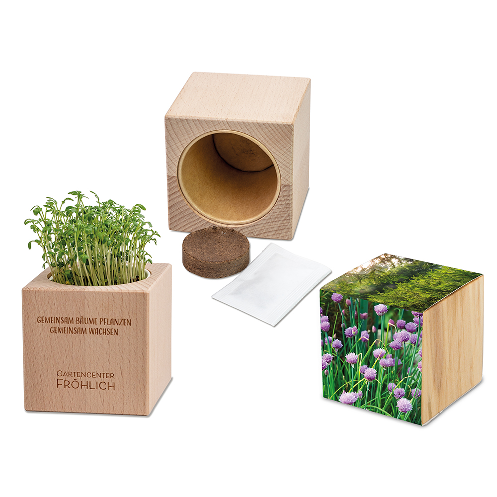 Viel mehr Werbefläche für noch bessere Marken- oder Produktwerbung des Unternehmens bietet das Pflanz-Holz Grande auf seiner umlaufenden Banderole aus Papier. Auf sagenhaften 32 x 7,5 cm kann individuell und hochwertig gedruckt werden. Und auch das bewährte Pflanz-Holz selbst bietet auf 5,5 x 5,5 cm auf allen vier Seiten eine echt "grande" Gravurfläche beispielsweise für Firmenlogo und Co.. In dem Pflanz-Holz befindet sich ein Becher aus Papier, um das Holz vor auslaufendem Wasser zu schützen. Mitgeliefert wird eine Substrattablette als Erde und eine Samensorte nach Wahl. Ein Produkt-Highlight mit großem Werbeeffekt!