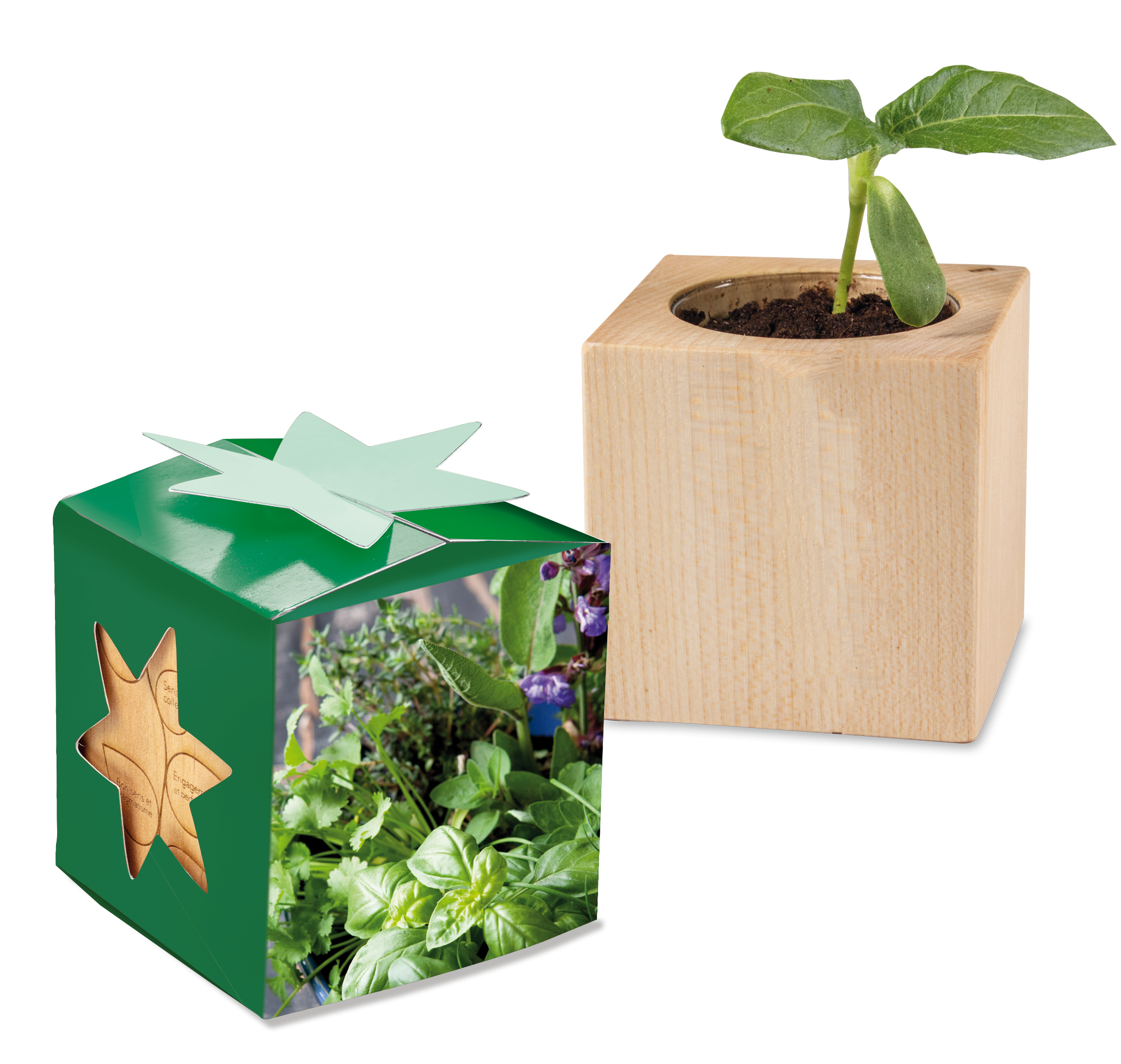 Der Würfel aus hellem, europäischem Holz wird mit beliebigem Samen und einer Substrattablette als Erde geliefert. Die Star-Box wird nach Kundenwunsch bedruckt und durch eine individuelle Lasergravur auf dem Produkt aus europäischem Holz einmalig. Der sternförmige Verschluss und zwei sternförmige Aussparungen in der Kartonage vollenden den perfekten Webeauftritt. Ein Stück Natur auf dem Schreibtisch oder der Fensterbank zeugt von dem grünen Fingerabdruck des werbenden Unternehmens.