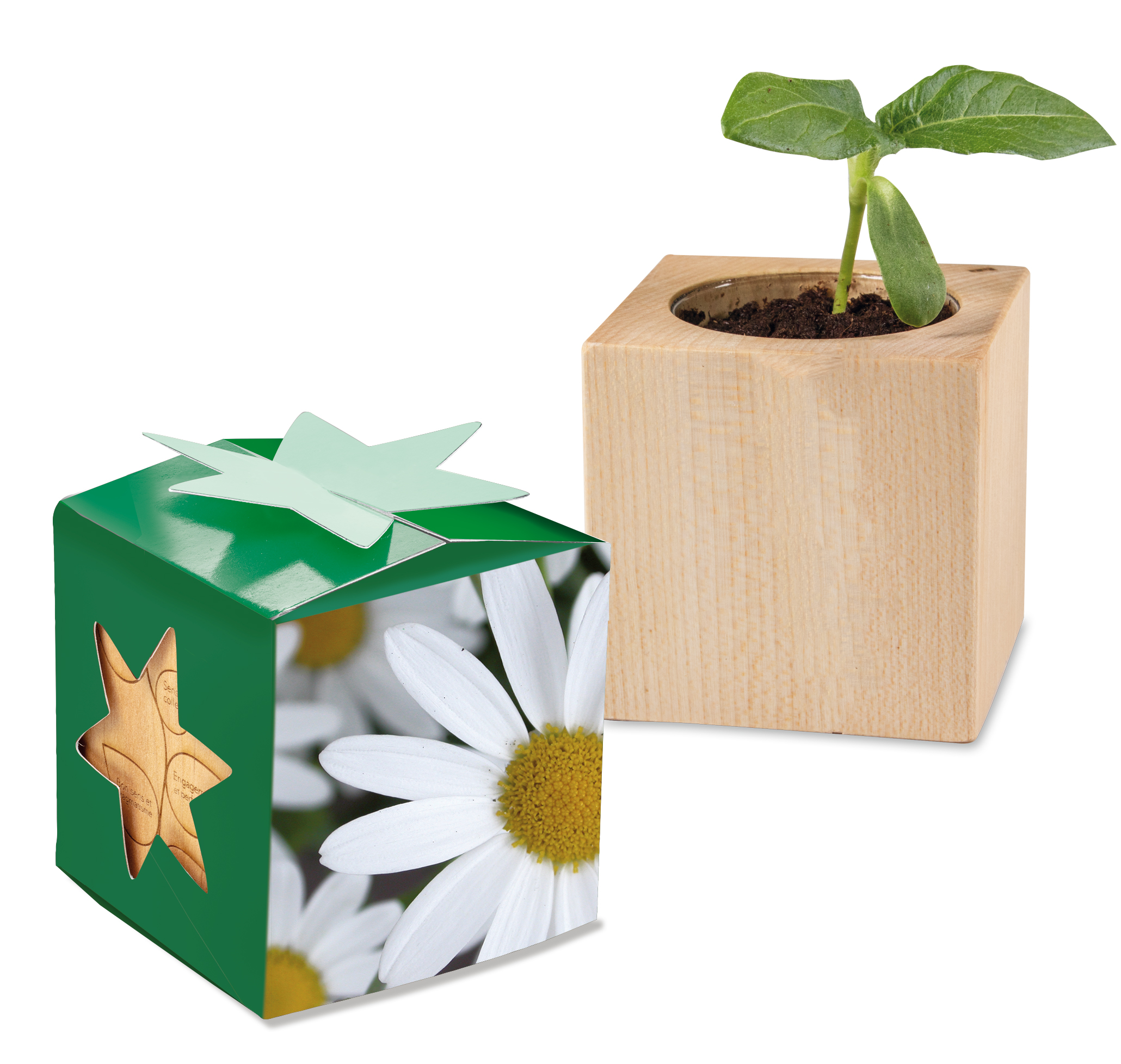 Der Würfel aus hellem, europäischem Holz wird mit beliebigem Samen und einer Substrattablette als Erde geliefert. Die Star-Box wird nach Kundenwunsch bedruckt und durch eine individuelle Lasergravur auf dem Produkt aus europäischem Holz einmalig. Der sternförmige Verschluss und zwei sternförmige Aussparungen in der Kartonage vollenden den perfekten Webeauftritt. Ein Stück Natur auf dem Schreibtisch oder der Fensterbank zeugt von dem grünen Fingerabdruck des werbenden Unternehmens.