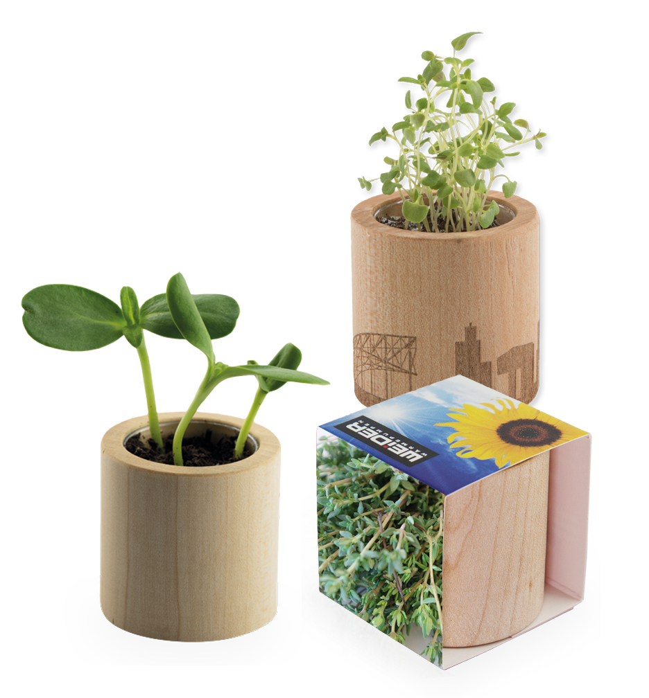 Das dekorative Pflanz-Holz rund aus europäischen Holz, wird mit beliebigem Samen und einer Substrattablette als Erde geliefert. Ihre Werbung findet auf der umliegenden Banderole Platz und optional ist eine Lasergravur auf dem Holzgefäß möglich.
