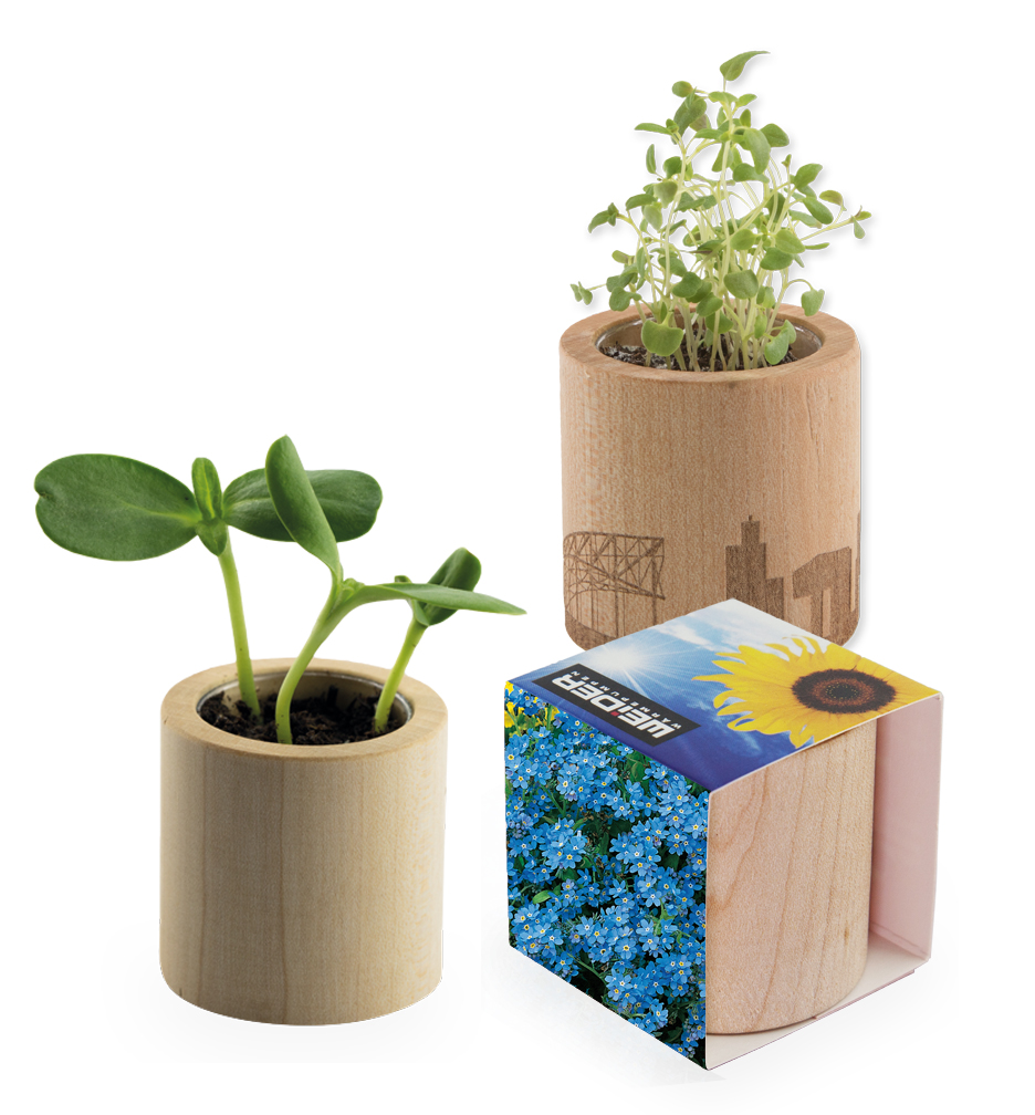 Das dekorative Pflanz-Holz rund aus europäischen Holz, wird mit beliebigem Samen und einer Substrattablette als Erde geliefert. Ihre Werbung findet auf der umliegenden Banderole Platz und optional ist eine Lasergravur auf dem Holzgefäß möglich.
