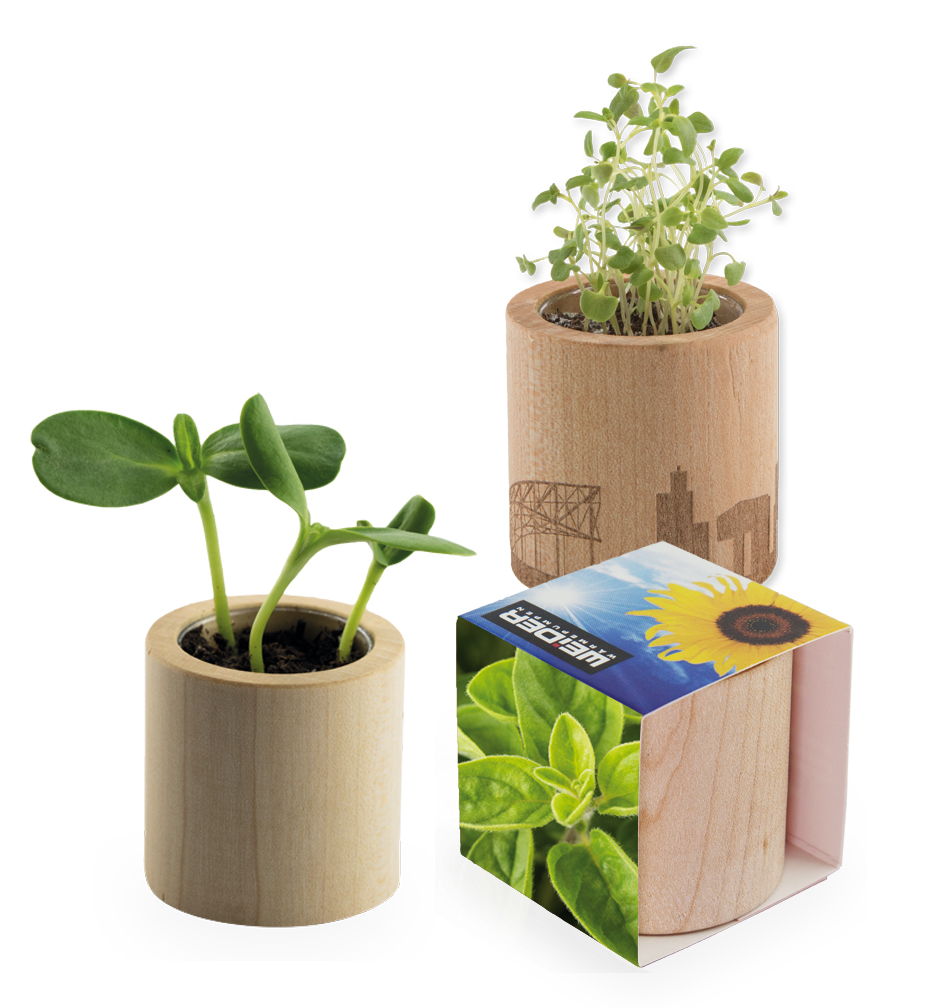 Das dekorative Pflanz-Holz rund aus europäischen Holz, wird mit beliebigem Samen und einer Substrattablette als Erde geliefert. Ihre Werbung findet auf der umliegenden Banderole Platz und optional ist eine Lasergravur auf dem Holzgefäß möglich.