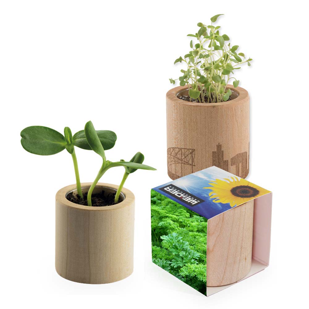 Das dekorative Pflanz-Holz rund aus europäischen Holz, wird mit beliebigem Samen und einer Substrattablette als Erde geliefert. Ihre Werbung findet auf der umliegenden Banderole Platz und optional ist eine Lasergravur auf dem Holzgefäß möglich.