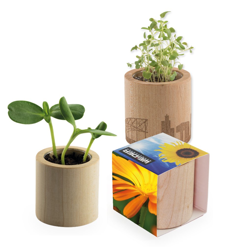 Das dekorative Pflanz-Holz rund aus europäischen Holz, wird mit beliebigem Samen und einer Substrattablette als Erde geliefert. Ihre Werbung findet auf der umliegenden Banderole Platz und optional ist eine Lasergravur auf dem Holzgefäß möglich.