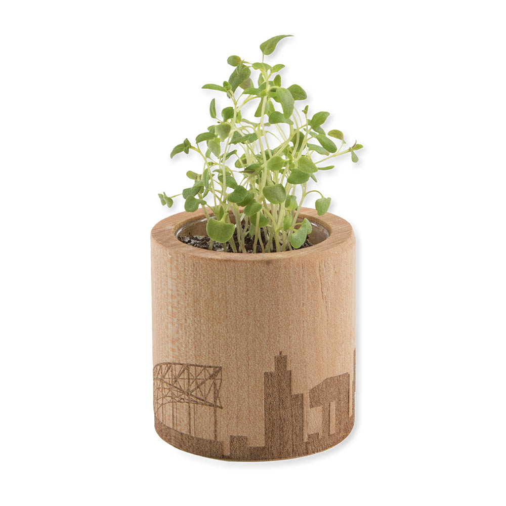 Das dekorative Pflanz-Holz rund aus europäischen Holz, wird mit beliebigem Samen und einer Substrattablette als Erde geliefert. Ihre Werbung findet auf der umliegenden Banderole Platz und optional ist eine Lasergravur auf dem Holzgefäß möglich.